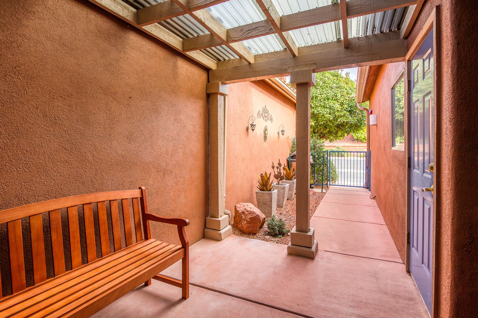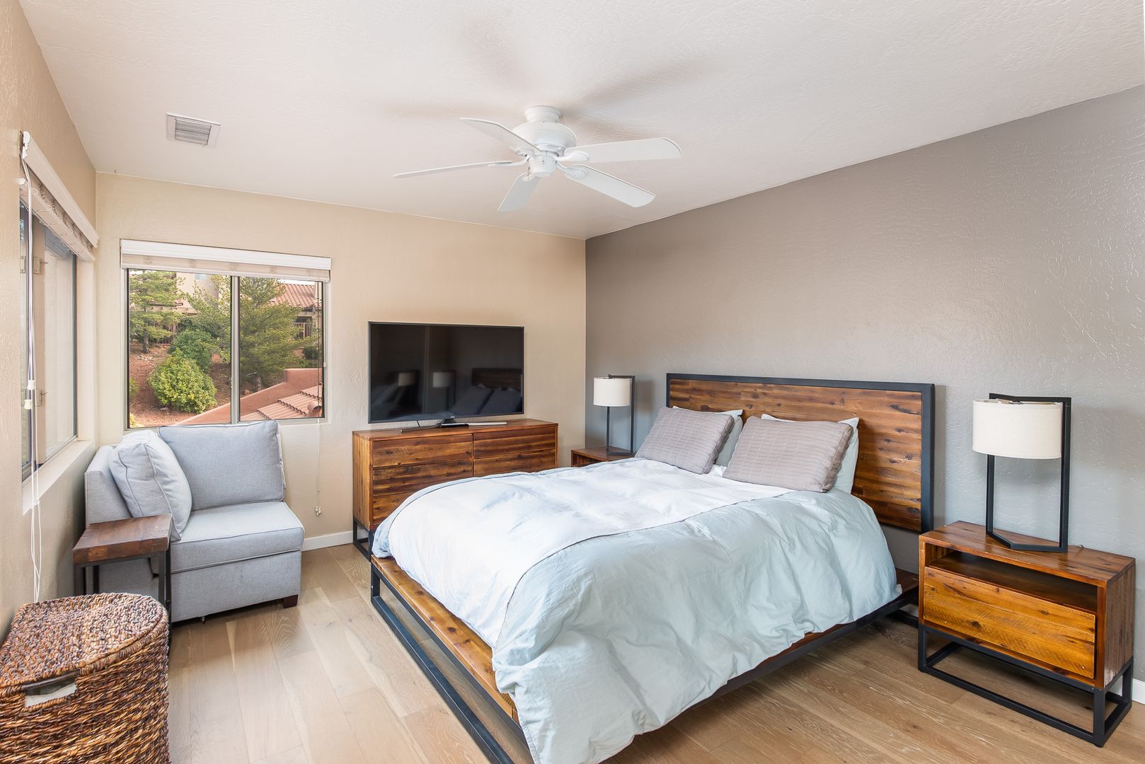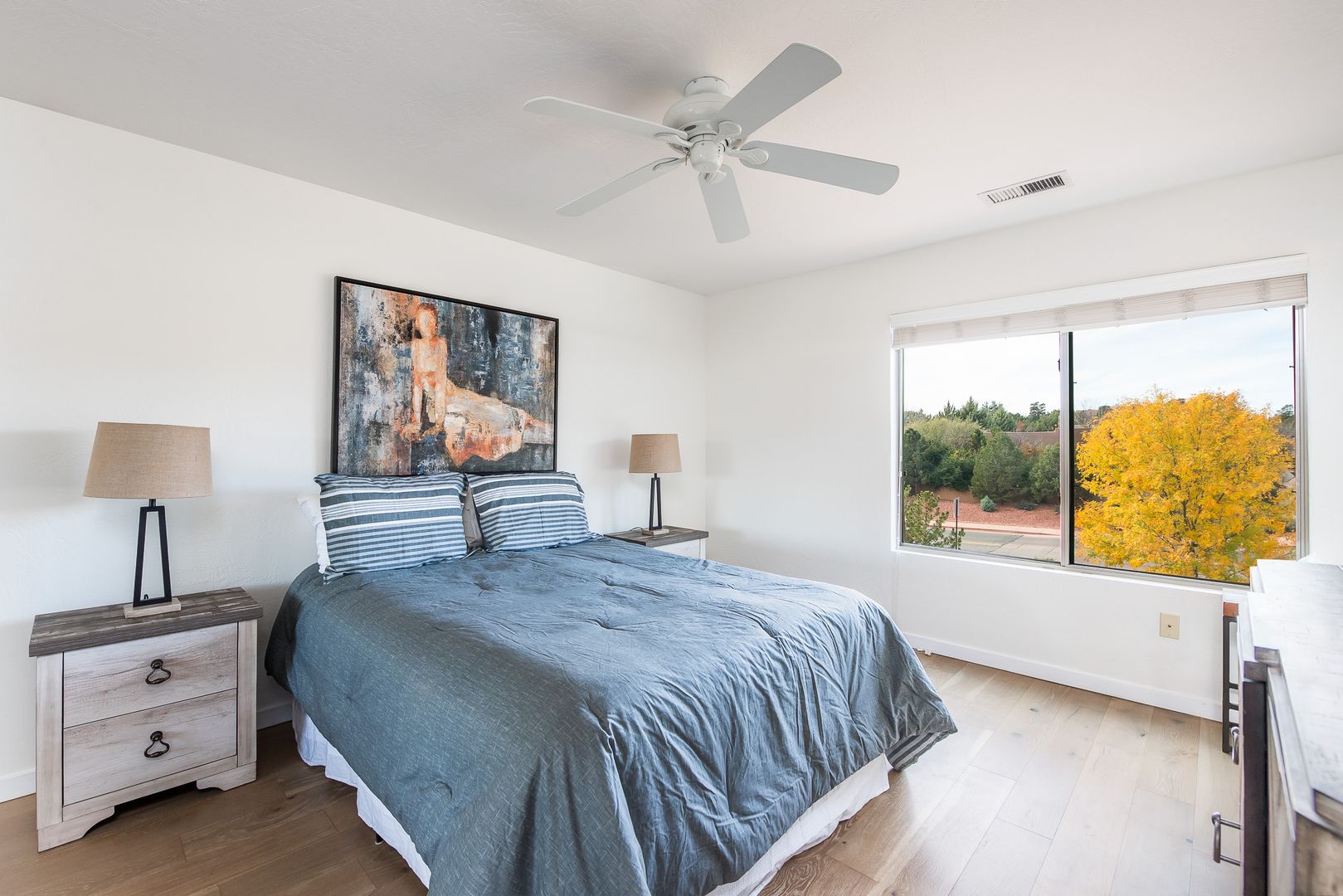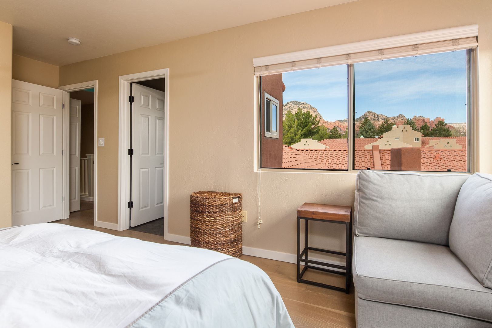This coveted two story, two bedroom Nepenthe unit is located in the heart of West Sedona. Completely redone in 2020, this property boasts a completely refinished kitchen with stainless steel appliances, quartz countertops, and beautifully refinished cabinetry. Complete with a private gated entryway, enter the covered entryway into the refinished great room with a gas fireplace, dining area, and passthrough to the kitchen perfect for entertaining. Guests have access to a thoughtfully redone half bath on the first floor.