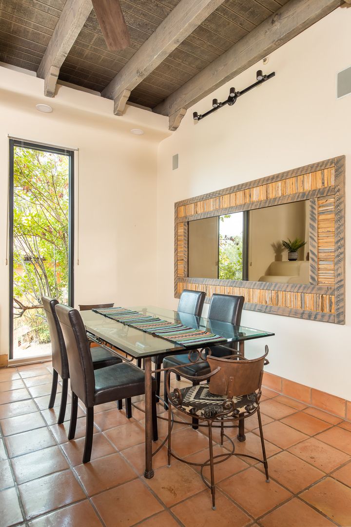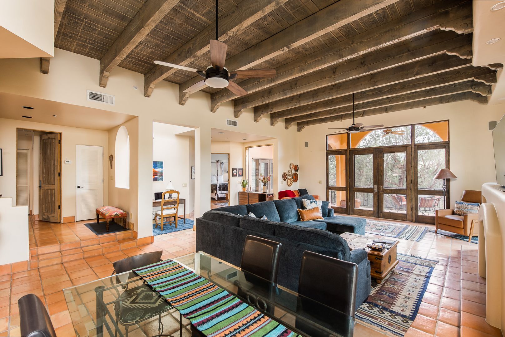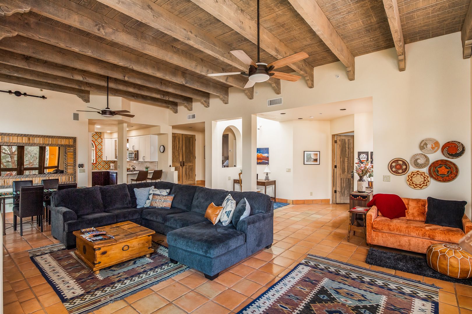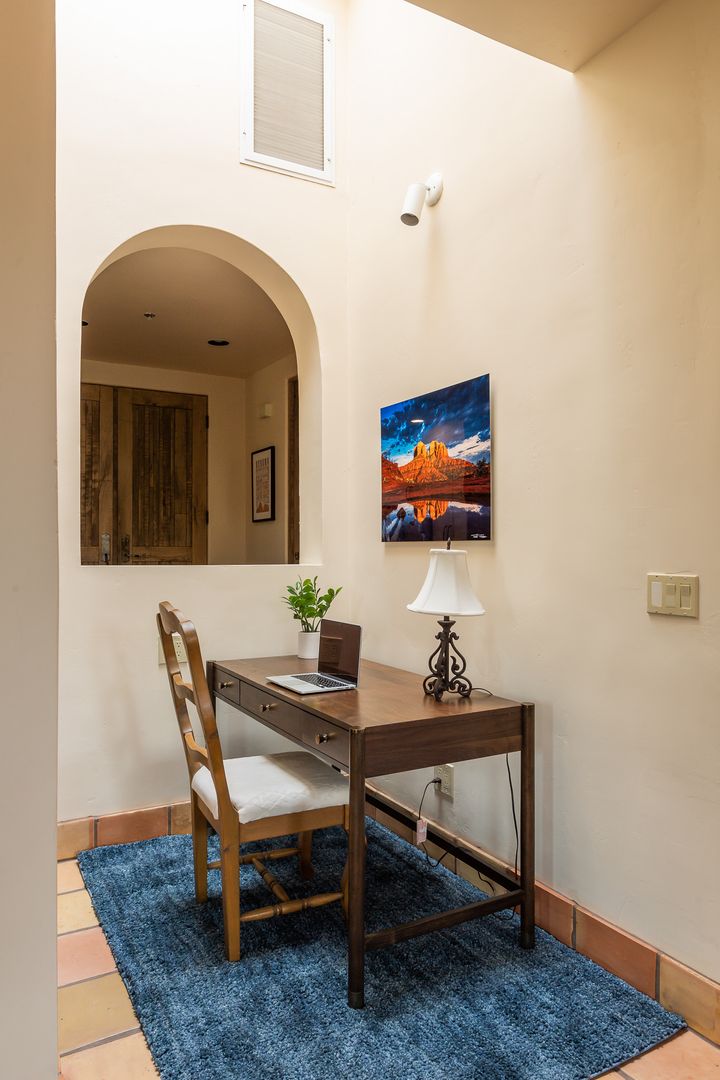 The great room has large windows on two sides to create an airy feeling and allow for views of trees and native habitat. All rooms have extra high ceilings with exposed beams, and floors are comprised of Saltillo tile. The living room includes a large comfortable sectional for watching the large screen TV. Bring your passwords and customize your viewing experience using streaming apps on this smart TV (no cable or satellite). Enjoy indoor-outdoor living by opening the French doors off the living room and letting the fresh air flow inside. You may even see the occasional javalina or deer pass through the backyard. The coral loveseat doubles as a pull-out twin sleeper if needed for an occasional guest, and a portable room divider provides additional privacy. The newly updated and remodeled kitchen has brand new appliances and an eat-in bar with seating for two. It has an adjacent laundry area with a stacked washer and dryer. Two workspaces support working remotely. One desk is in the living room, and the other is in the guest room. .