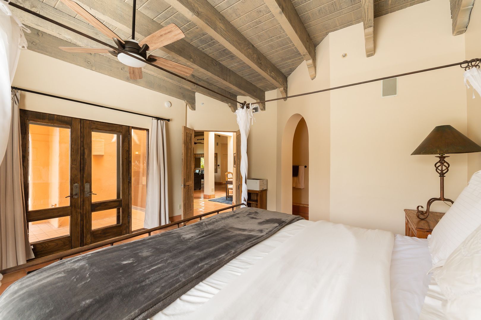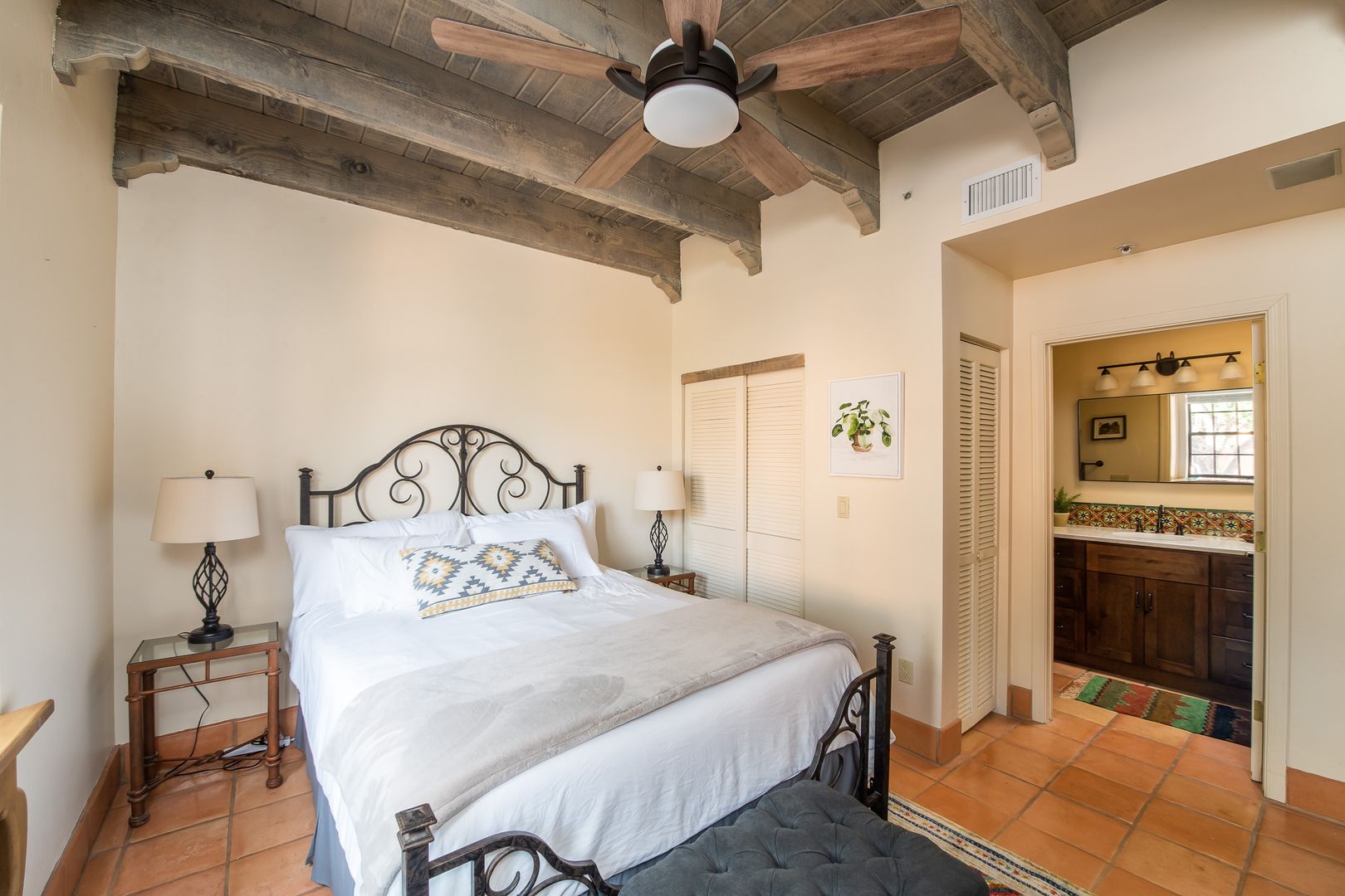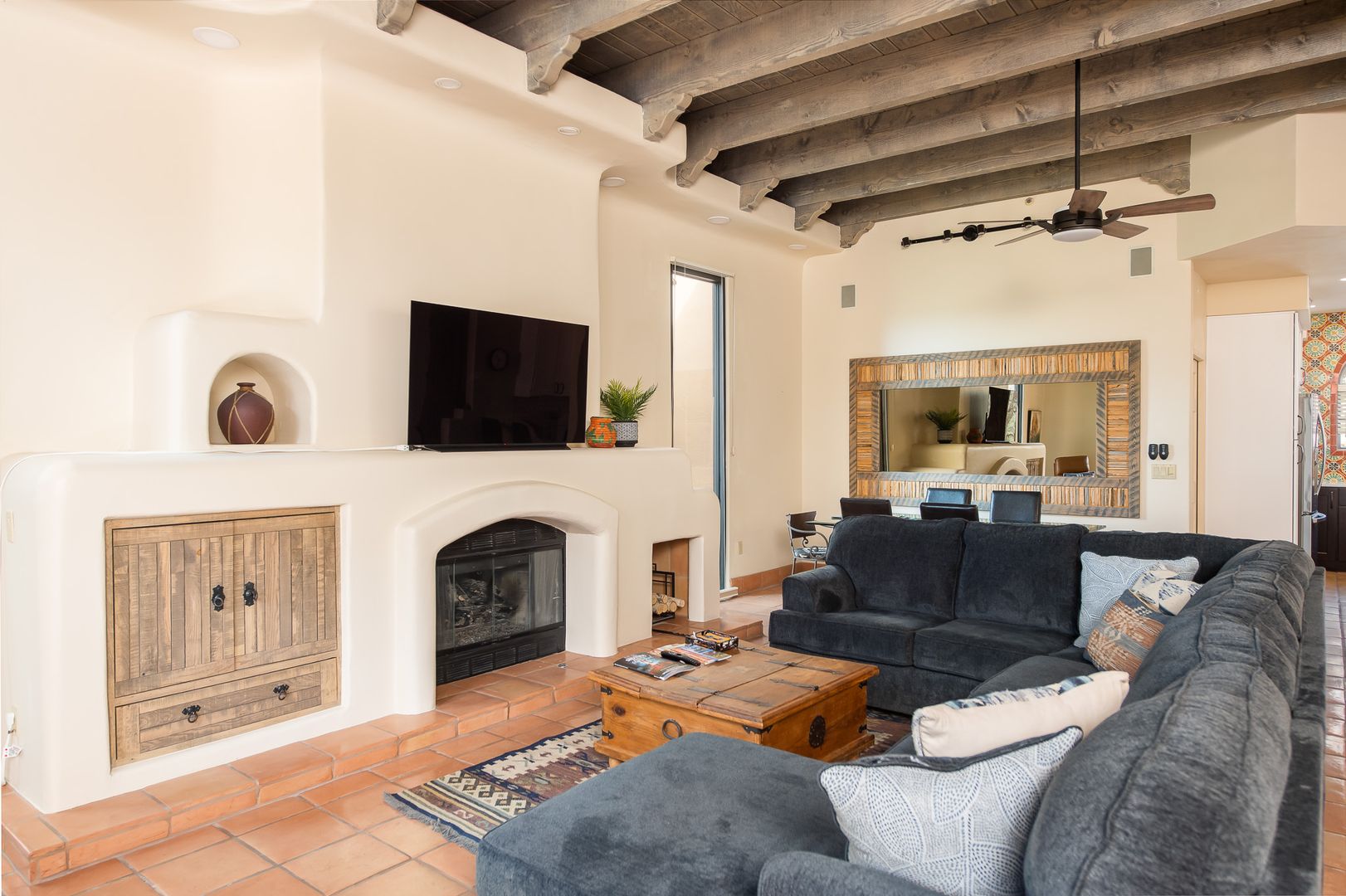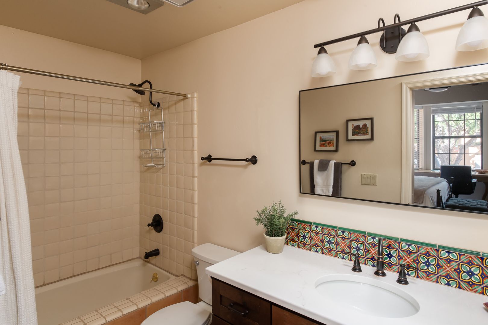 The great room has large windows on two sides to create an airy feeling and allow for views of trees and native habitat. All rooms have extra high ceilings with exposed beams, and floors are comprised of Saltillo tile. The living room includes a large comfortable sectional for watching the large screen TV. Bring your passwords and customize your viewing experience using streaming apps on this smart TV (no cable or satellite). Enjoy indoor-outdoor living by opening the French doors off the living room and letting the fresh air flow inside. You may even see the occasional javalina or deer pass through the backyard. The coral loveseat doubles as a pull-out twin sleeper if needed for an occasional guest, and a portable room divider provides additional privacy. The newly updated and remodeled kitchen has brand new appliances and an eat-in bar with seating for two. It has an adjacent laundry area with a stacked washer and dryer. Two workspaces support working remotely. One desk is in the living room, and the other is in the guest room. .