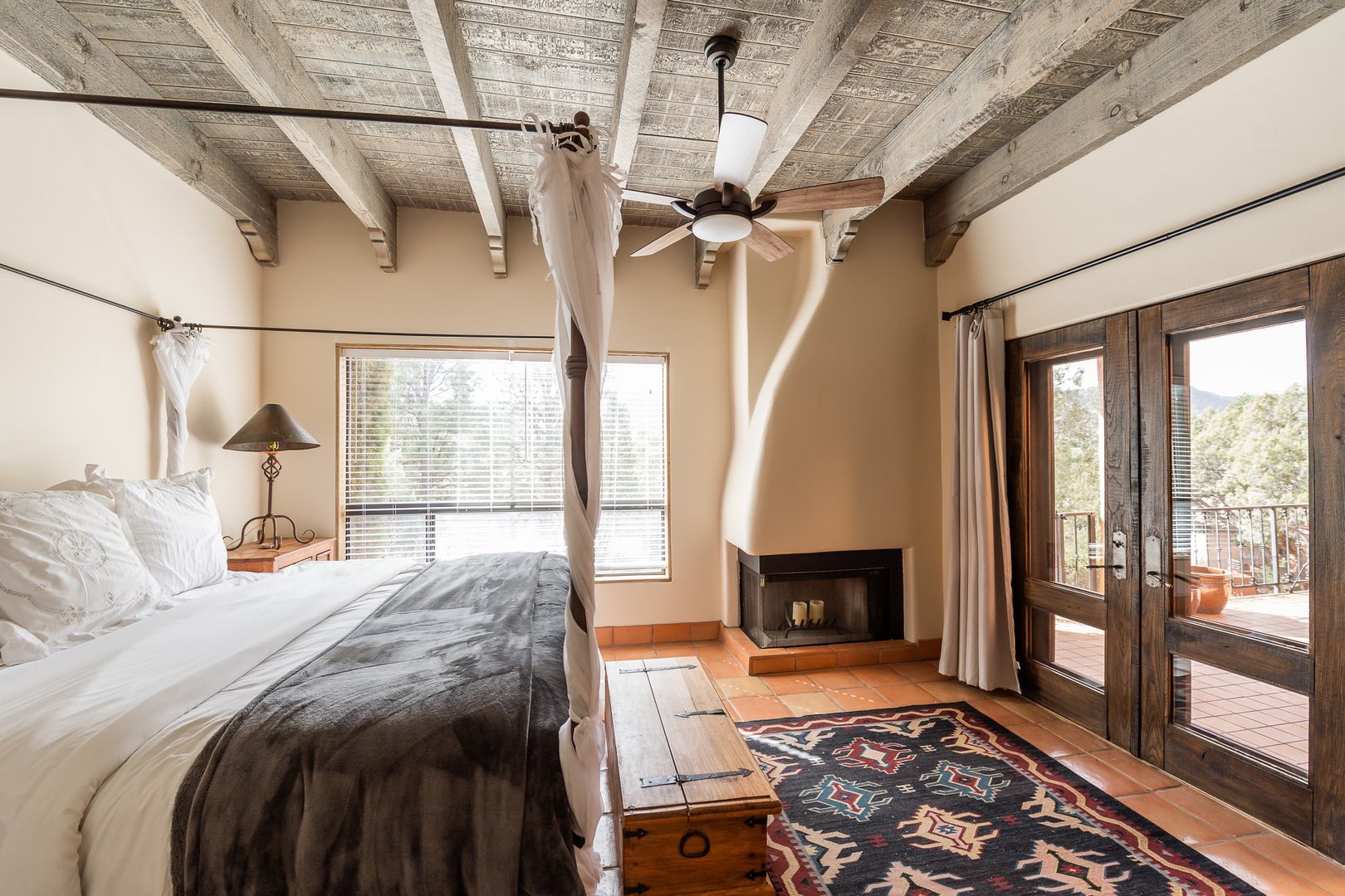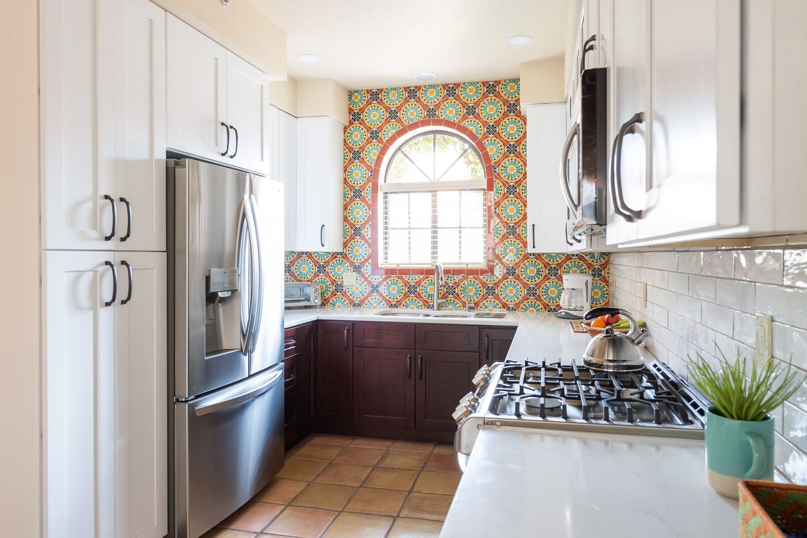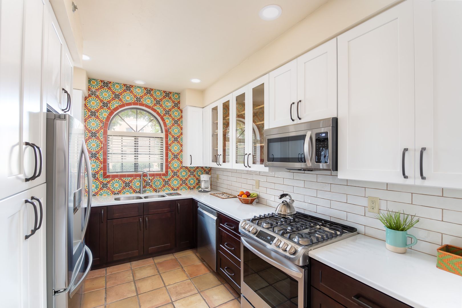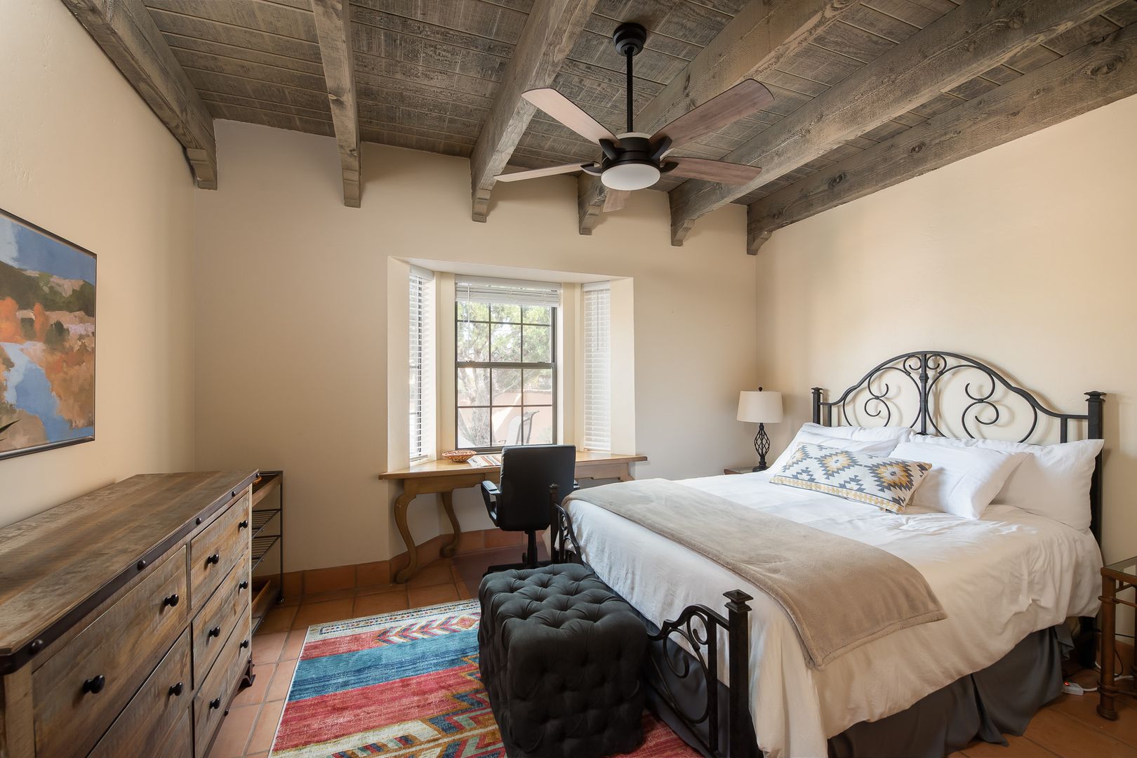 The great room has large windows on two sides to create an airy feeling and allow for views of trees and native habitat. All rooms have extra high ceilings with exposed beams, and floors are comprised of Saltillo tile. The living room includes a large comfortable sectional for watching the large screen TV. Bring your passwords and customize your viewing experience using streaming apps on this smart TV (no cable or satellite). Enjoy indoor-outdoor living by opening the French doors off the living room and letting the fresh air flow inside. You may even see the occasional javalina or deer pass through the backyard. The coral loveseat doubles as a pull-out twin sleeper if needed for an occasional guest, and a portable room divider provides additional privacy. The newly updated and remodeled kitchen has brand new appliances and an eat-in bar with seating for two. It has an adjacent laundry area with a stacked washer and dryer. Two workspaces support working remotely. One desk is in the living room, and the other is in the guest room. .