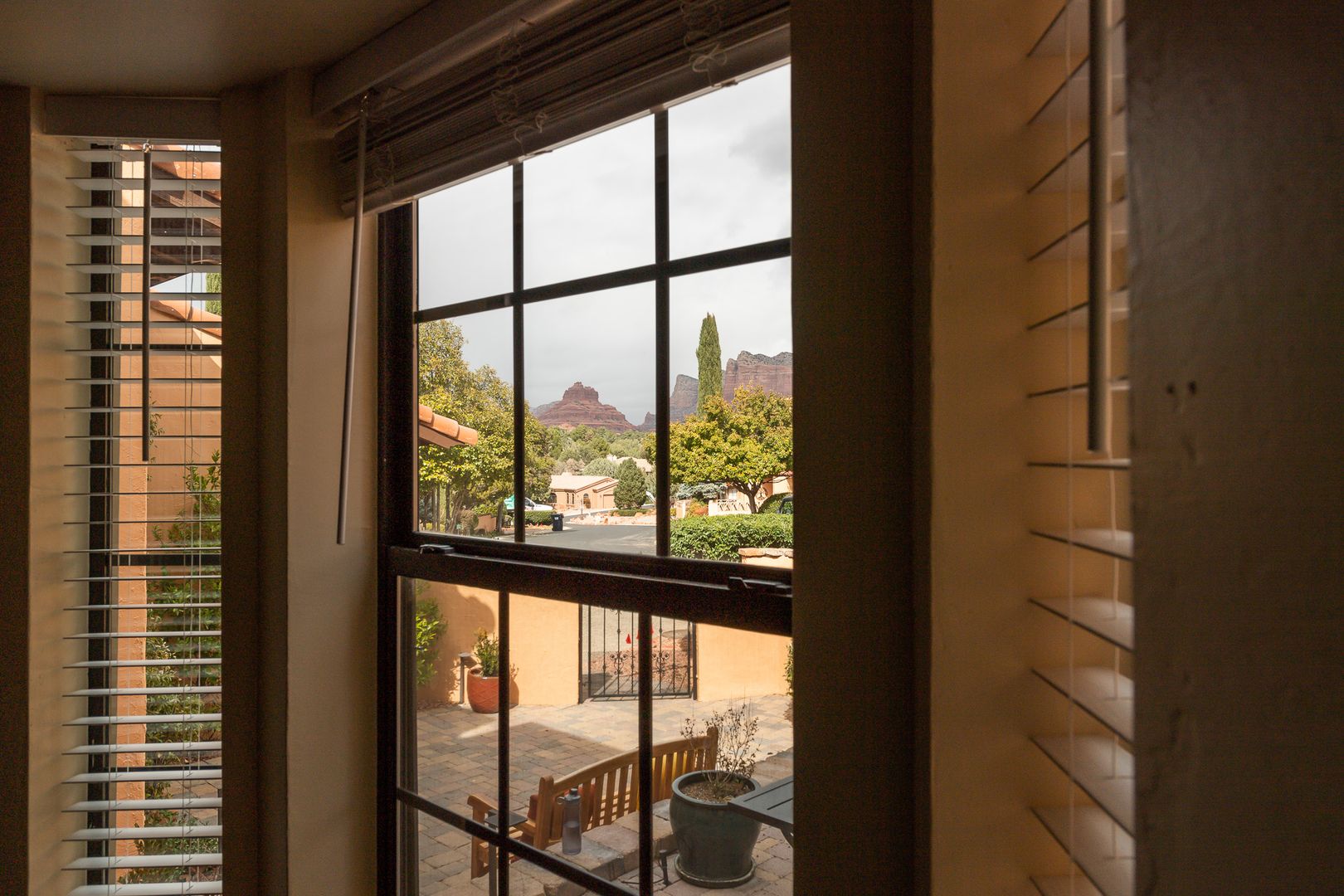 The generous main bedroom with king size bed has a curvy faux fireplace and an en-suite with dual vanities, a step-in shower (a small step up and a larger step down) and a walk-in closet. French doors open to the back deck, and a large picture window gives a view of the backyard. The guest room (two steps up) has its own en-suite with a single vanity and tub-shower combination. Enjoy the sunrise on Bell Rock from the comfort of your queen-sized bed. Bedrooms are on opposite sides of the home so they offer good privacy. The front patio has a table and seating for four with a view of Bell Rock and Courthouse Butte. You can cross the backyard and walk a golf course for exercise before or after hours. The views are truly amazing, and it is a good place to see additional wildlife.