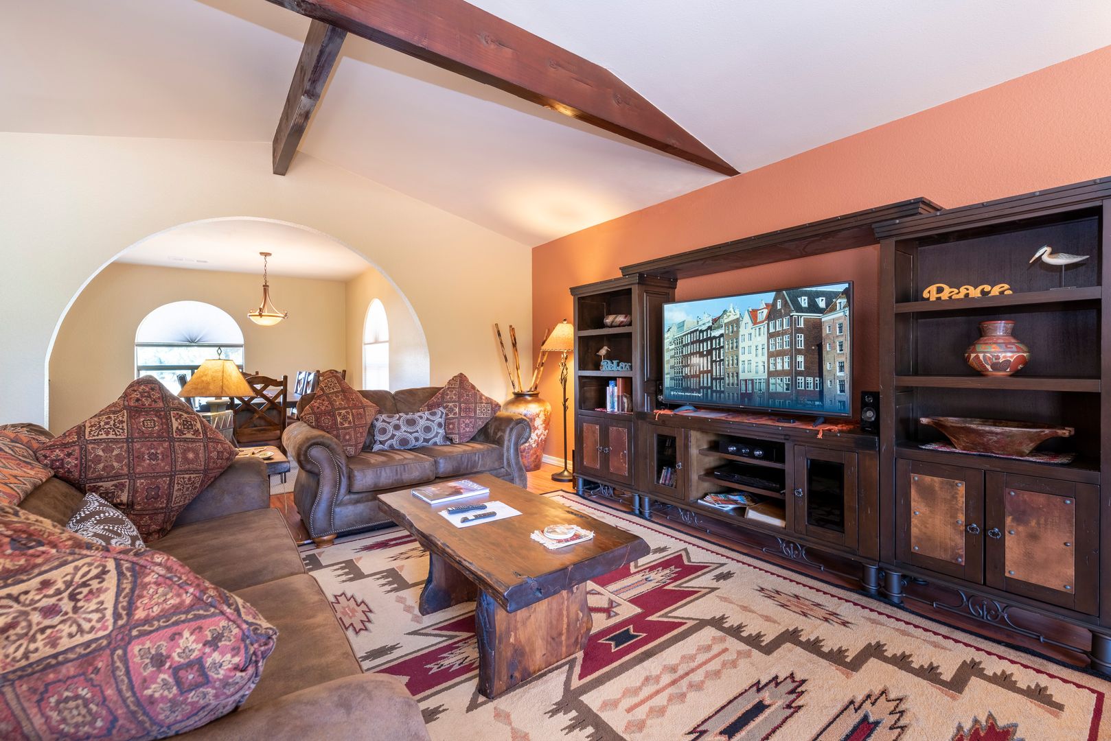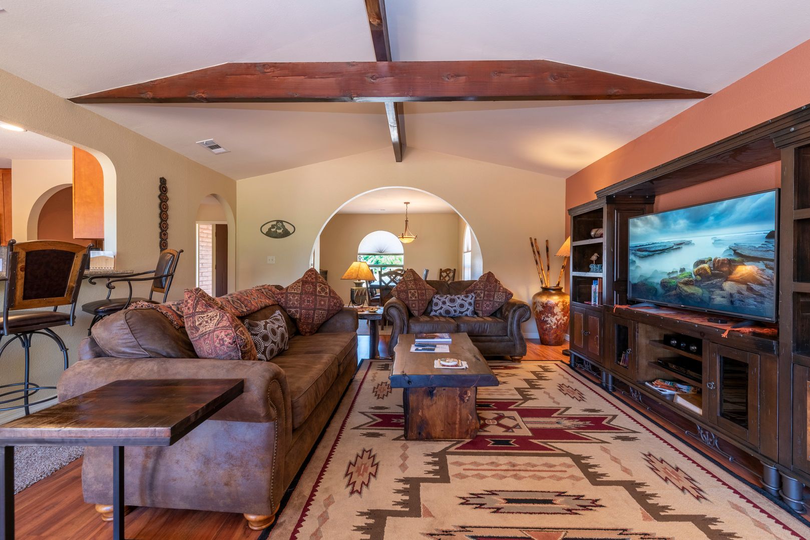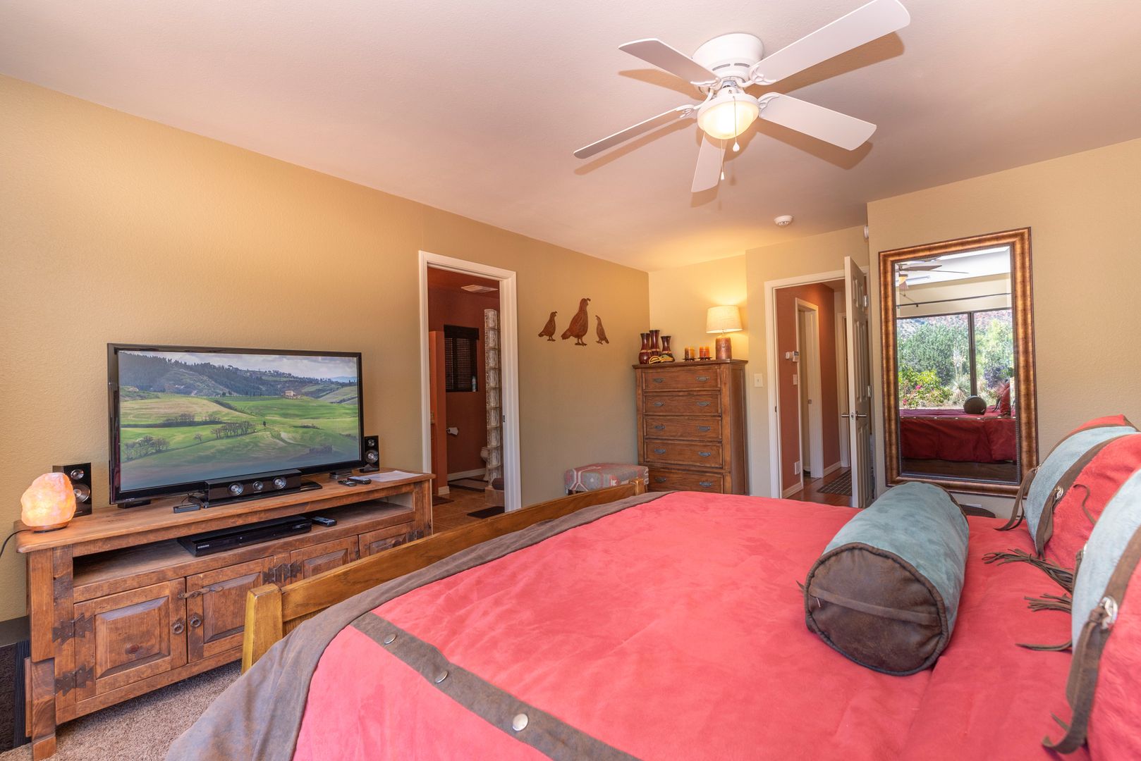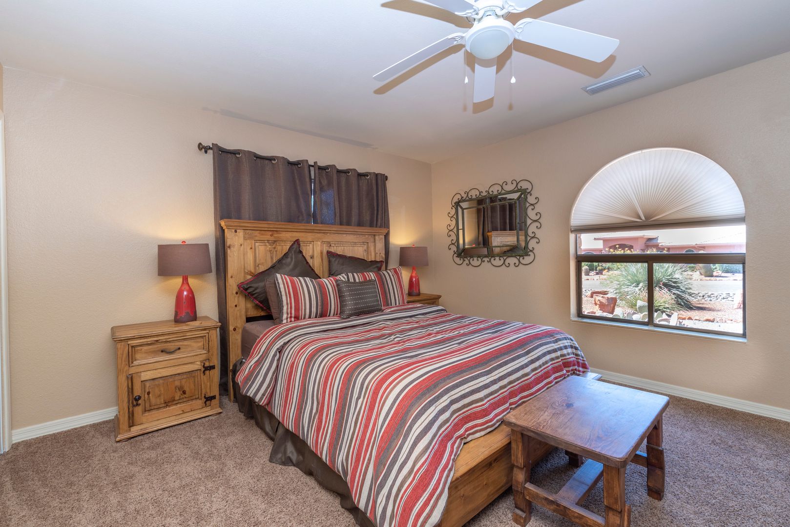 This charming 3 bed/3 full bath single story home boasts lovely backyard red rock views, complete with a fire pit, hammock, and spacious half acre yard. The master bedroom has an amazing red rock picturesque view. Awaken to the sun glimmering over the rocks, and have coffee on the lovely patio. The kitchen is well equipped with modern appliances, granite counters, and plenty of space for food preparations. Enjoy the comfort of the living room well furnished to watch movies on HULU, or relax on the lounger and take in nature through the picture window. The formal dining room seats 6 comfortably at a hand carved wooden dining table. Both guest bedrooms offer queen size beds. One has an on-suite bathroom, and the other guest bedroom has an adjacent full bathroom in the hallway. The neighborhood is quiet, and private. A two car carport is attached with access to the home through the laundry room, and there is gated RV parking. A peaceful vacation awaits in this lovely maintained home.