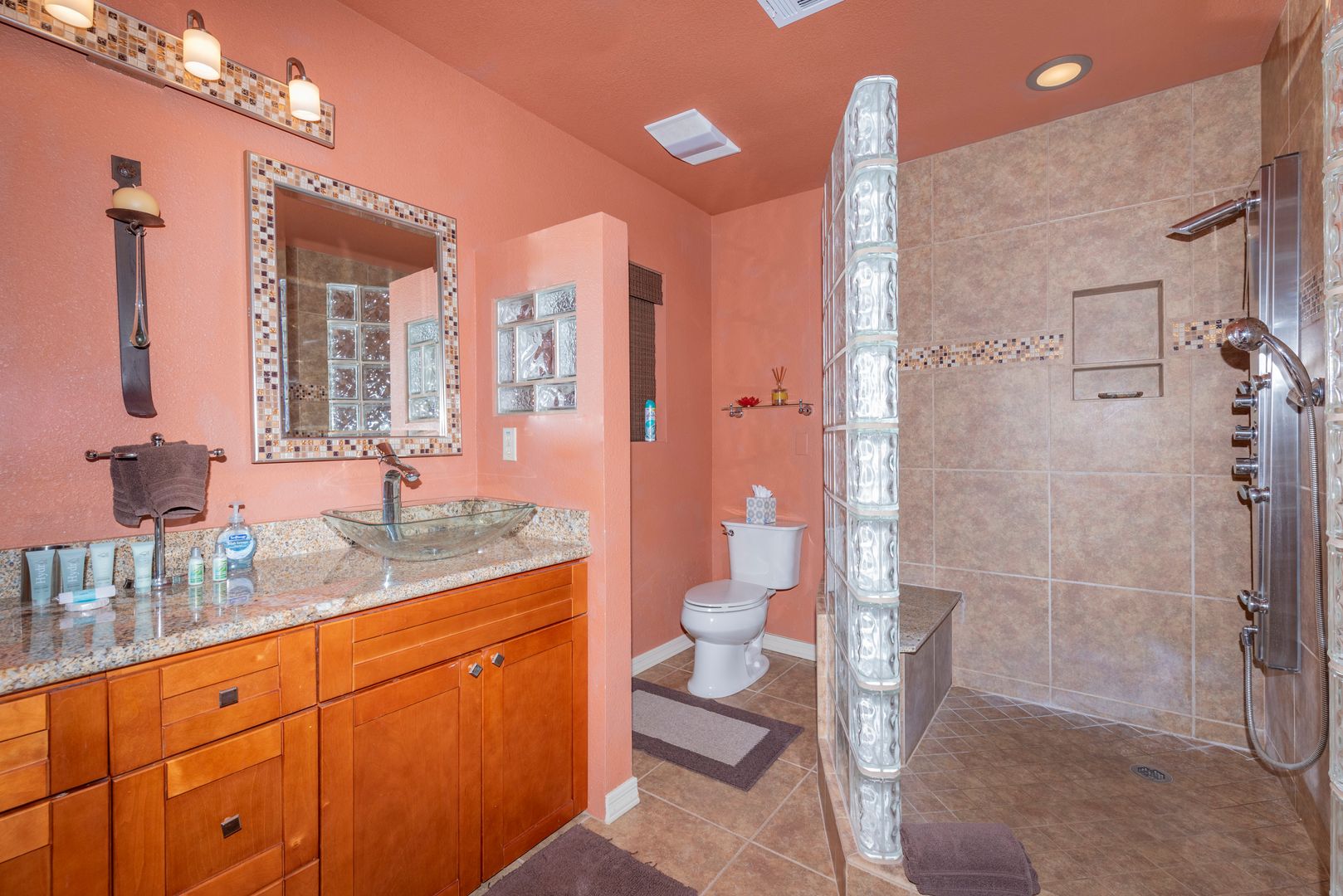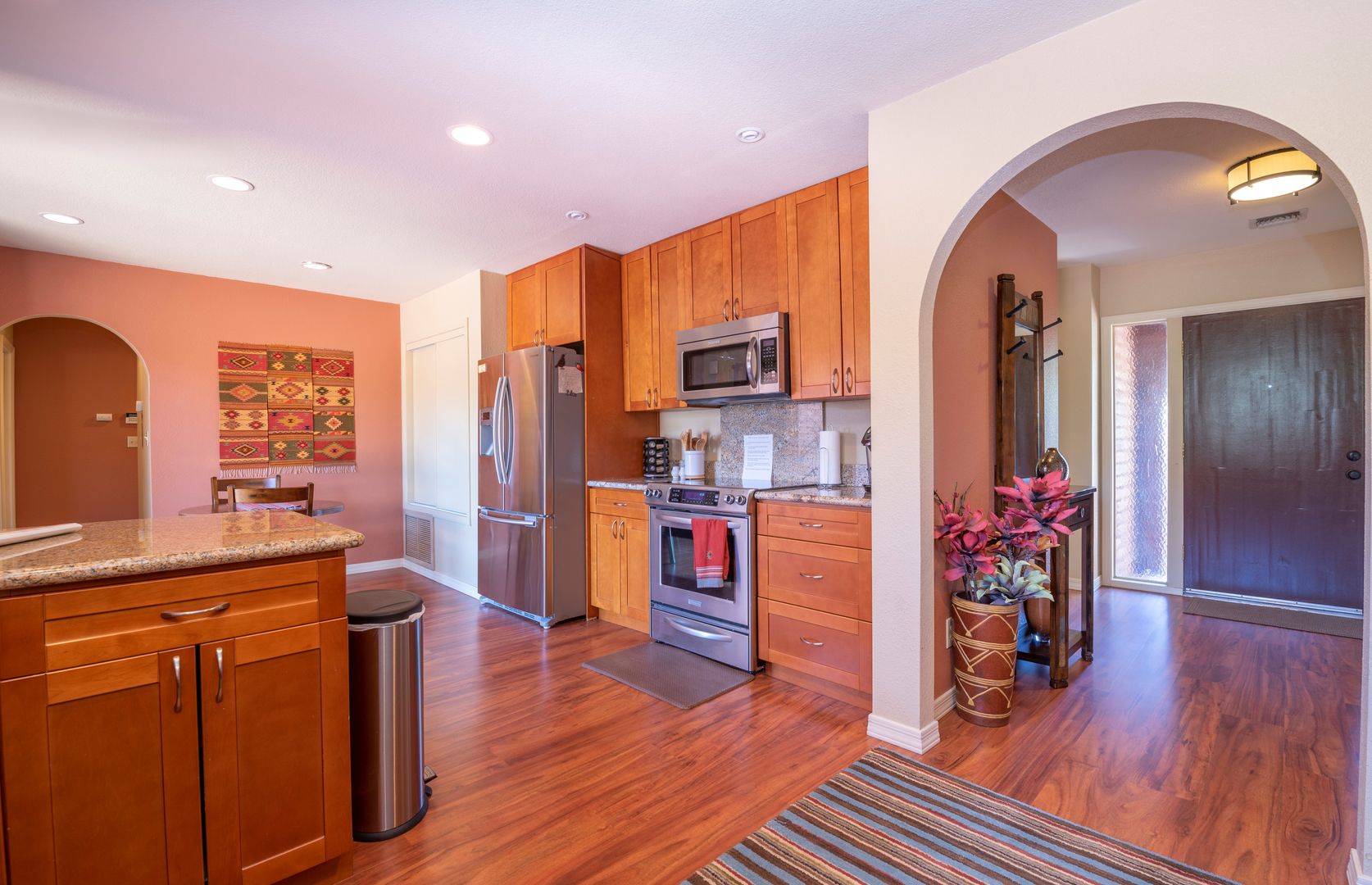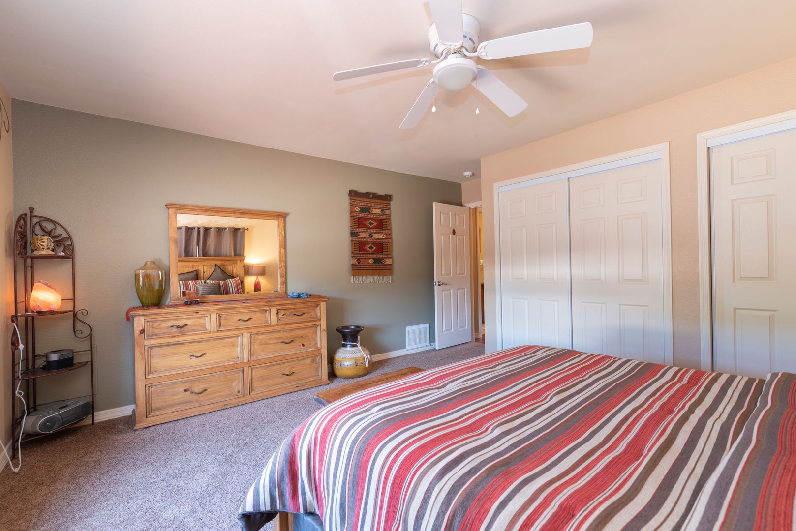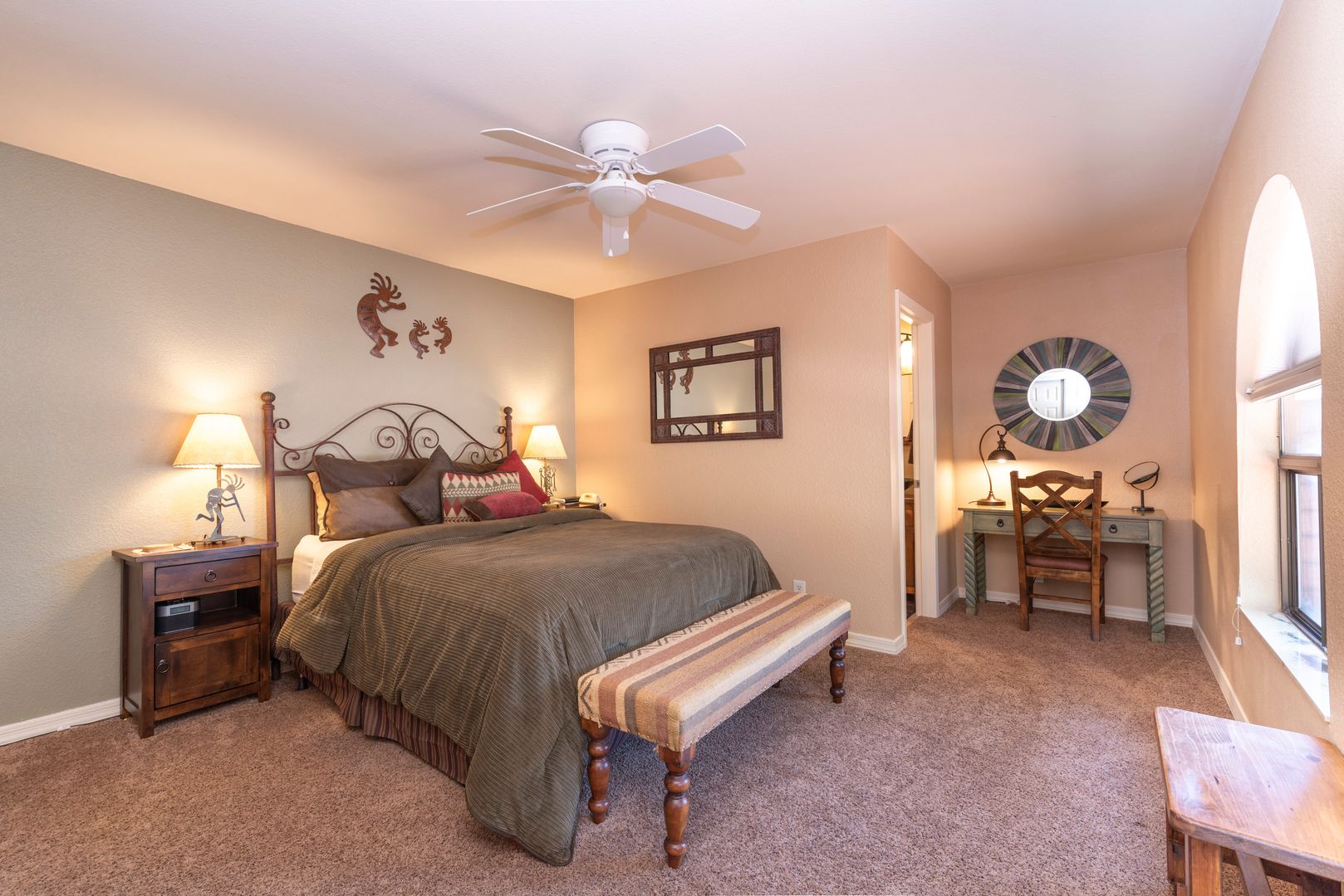 This charming 3 bed/3 full bath single story home boasts lovely backyard red rock views, complete with a fire pit, hammock, and spacious half acre yard. The master bedroom has an amazing red rock picturesque view. Awaken to the sun glimmering over the rocks, and have coffee on the lovely patio. The kitchen is well equipped with modern appliances, granite counters, and plenty of space for food preparations. Enjoy the comfort of the living room well furnished to watch movies on HULU, or relax on the lounger and take in nature through the picture window. The formal dining room seats 6 comfortably at a hand carved wooden dining table. Both guest bedrooms offer queen size beds. One has an on-suite bathroom, and the other guest bedroom has an adjacent full bathroom in the hallway. The neighborhood is quiet, and private. A two car carport is attached with access to the home through the laundry room, and there is gated RV parking. A peaceful vacation awaits in this lovely maintained home.