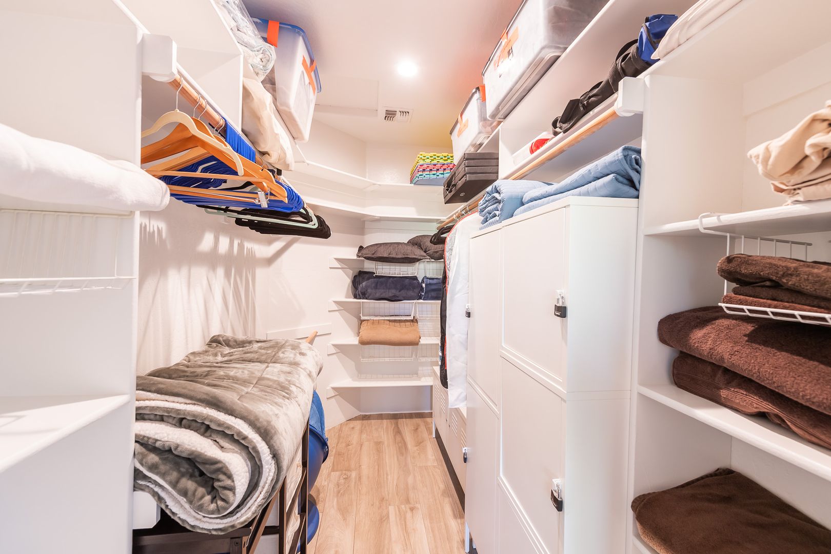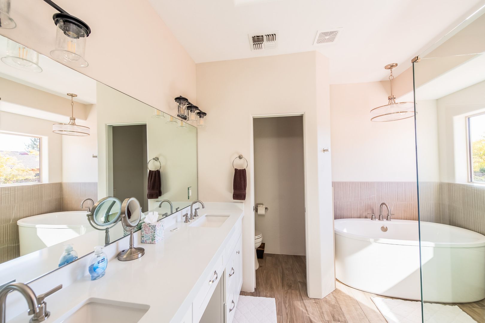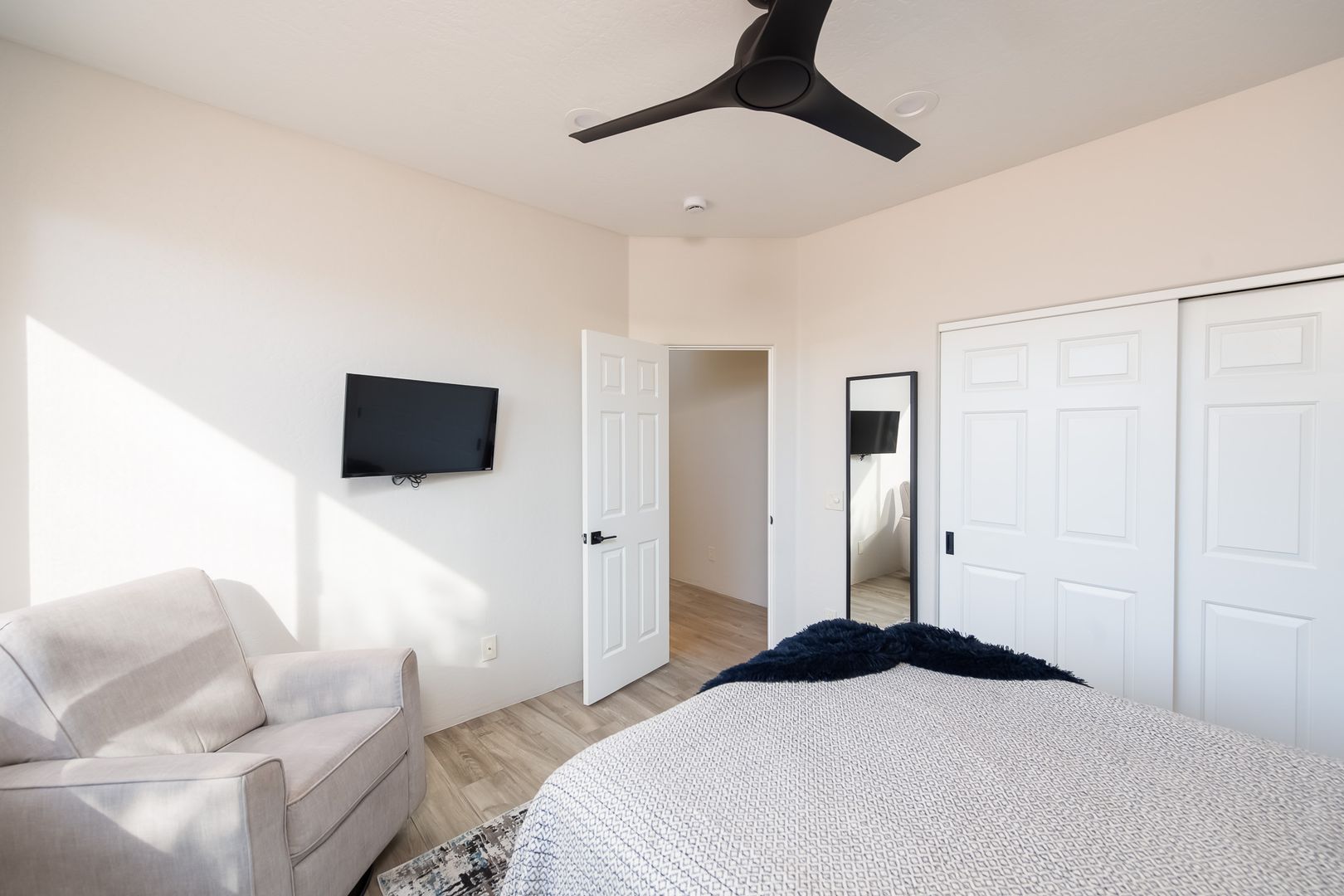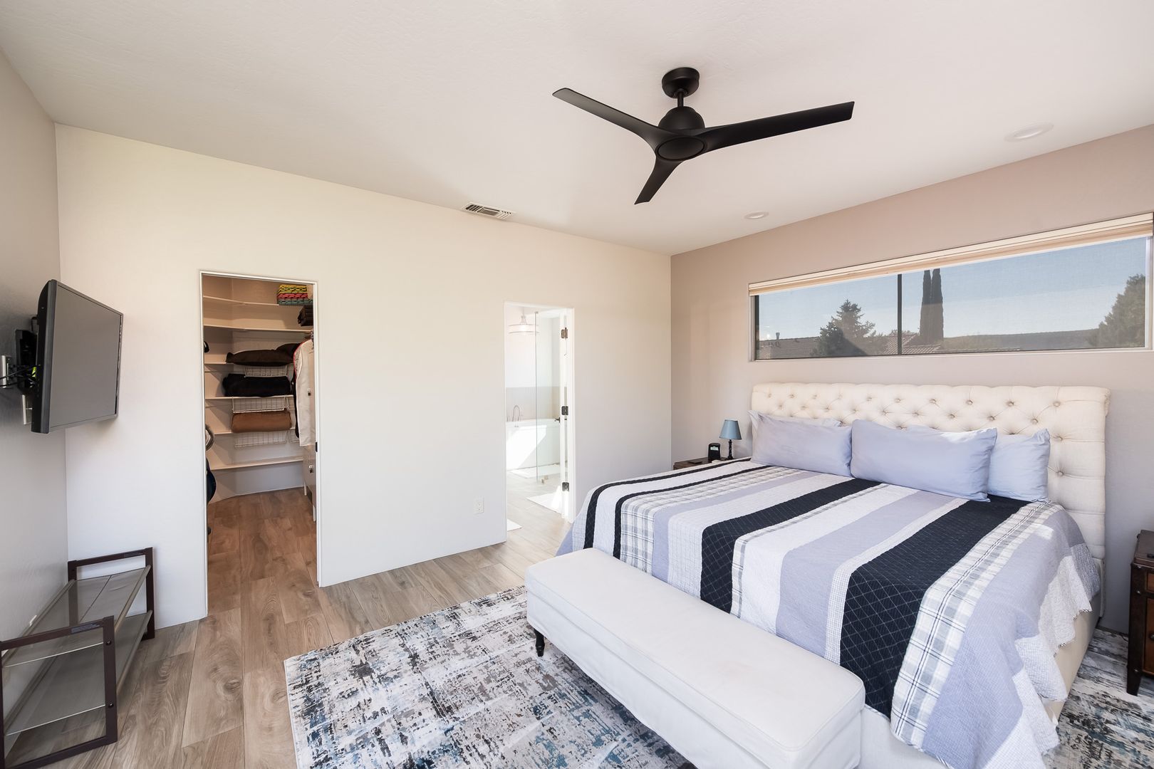 The spacious primary suite offers a king-size bed, sitting area, flat-screen TV, and walk-in closet. The en-suite bath includes dual sinks, a soaking tub, and a separate shower.