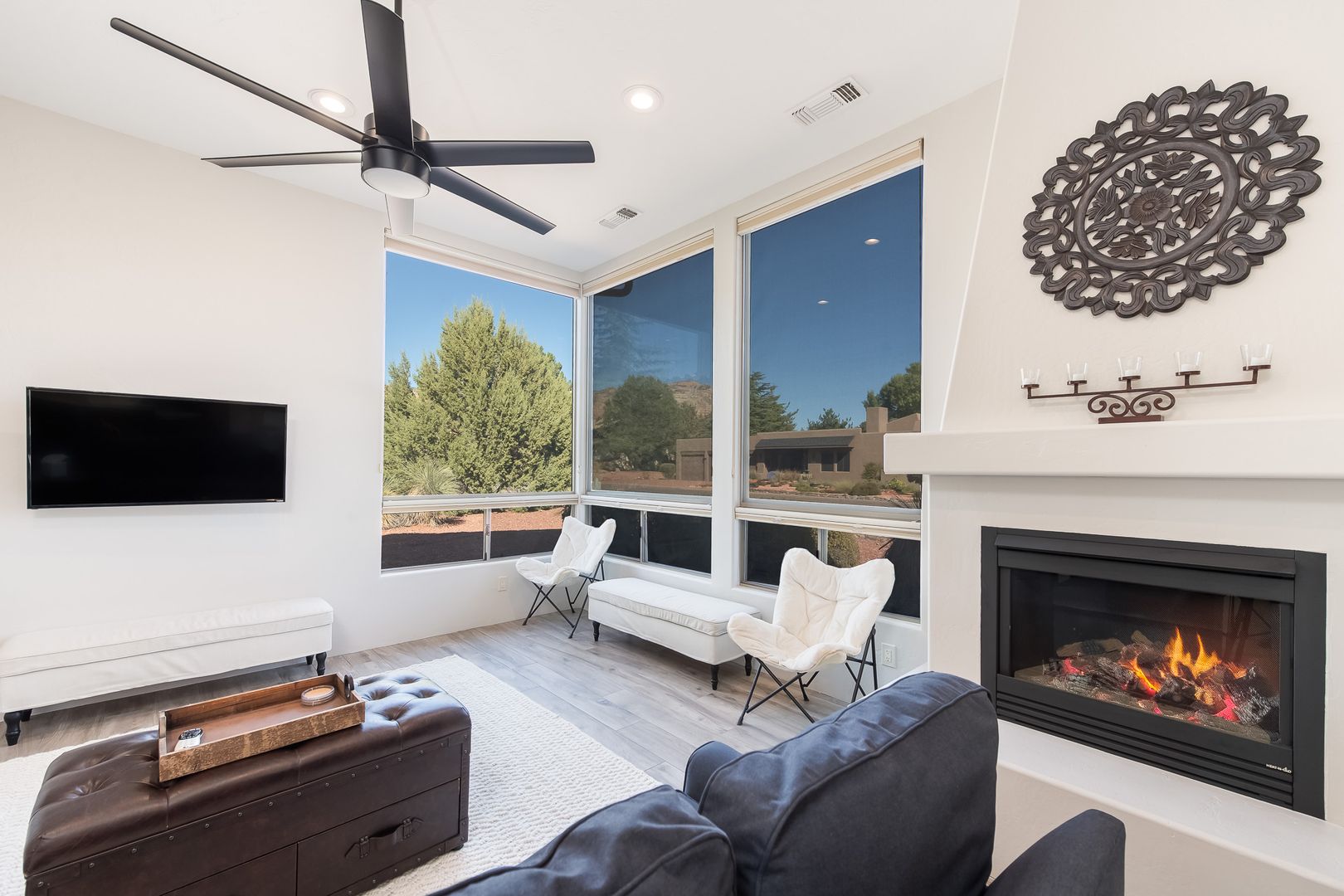 Enter through a charming courtyard with a private sitting area and red rock vistas. The living room showcases cathedral ceilings, three large picture windows, a gas fireplace, art niches, and a flat-screen TV, creating a warm and inviting space.