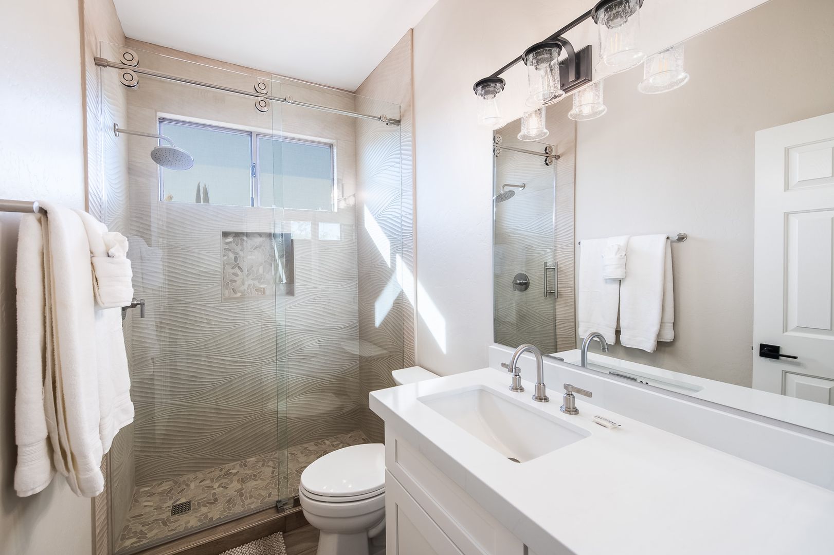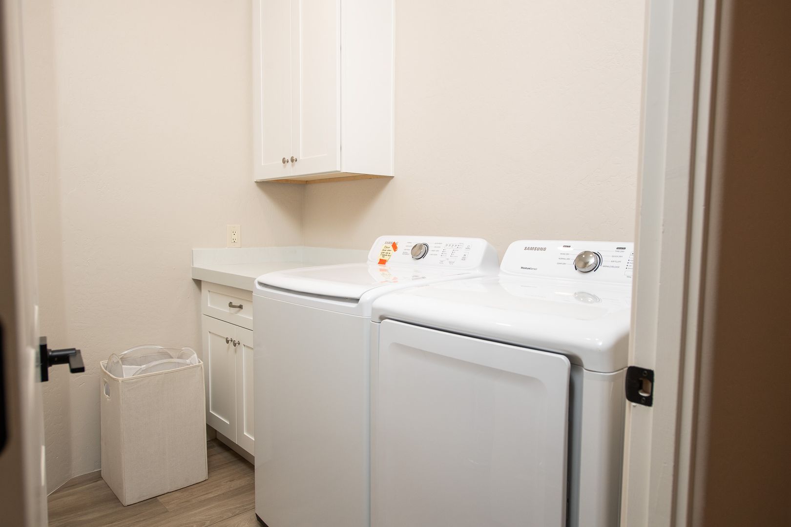 On the opposite side of the home are two guest bedrooms—one with a queen bed and one with a sleeper sofa—along with a full bath and separate laundry room.