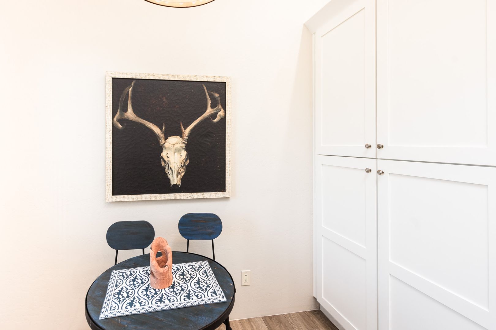 The well-appointed kitchen features stainless steel appliances, a gas stove, granite countertops, and a breakfast nook with courtyard access. The adjacent dining area comfortably seats six and opens to a covered patio, ideal for indoor-outdoor living.