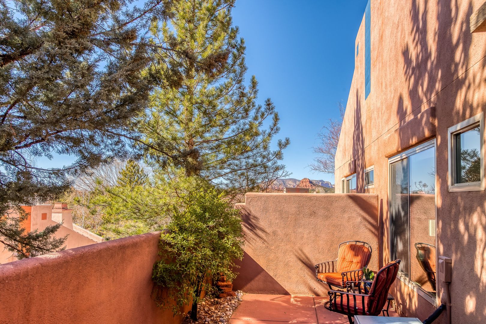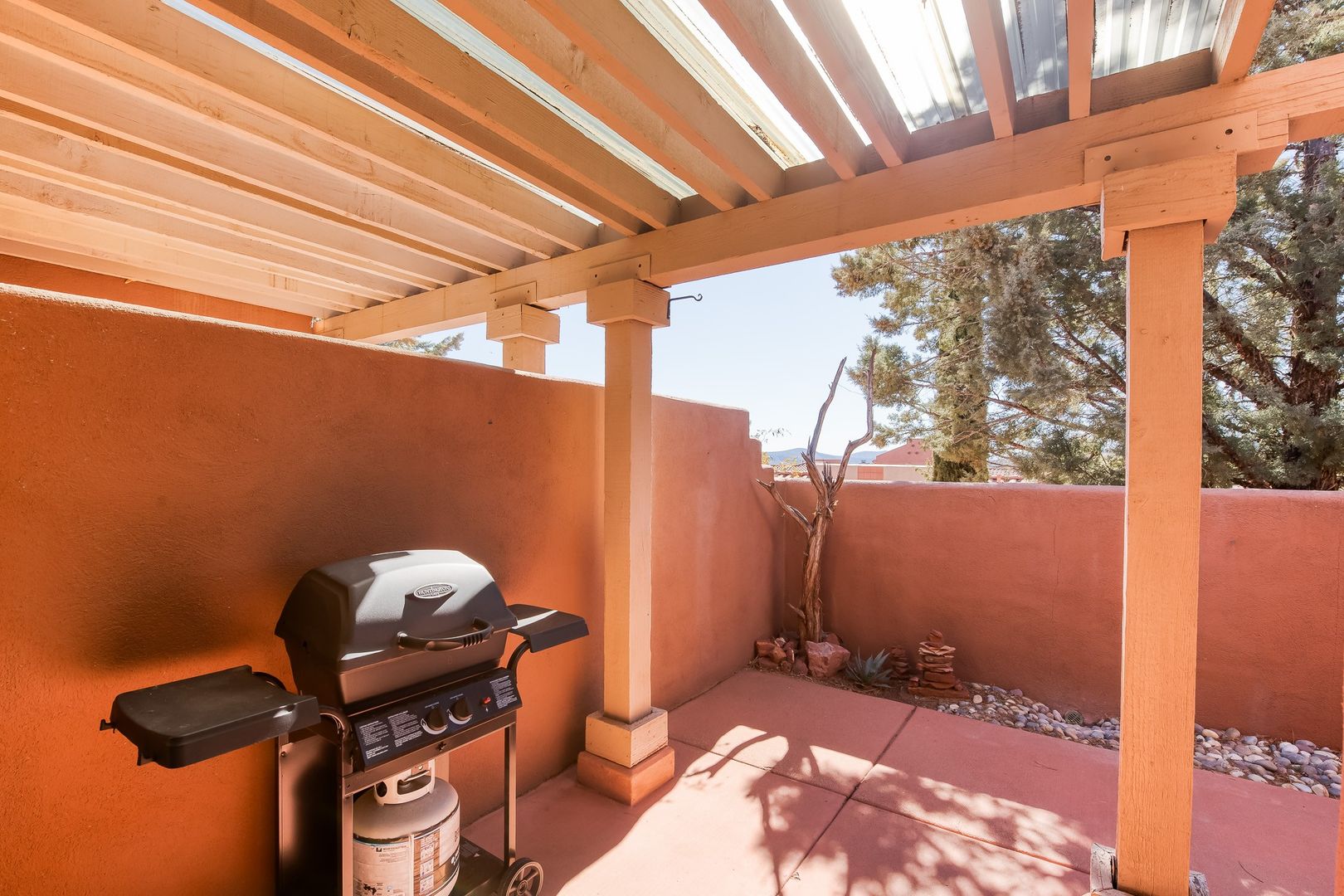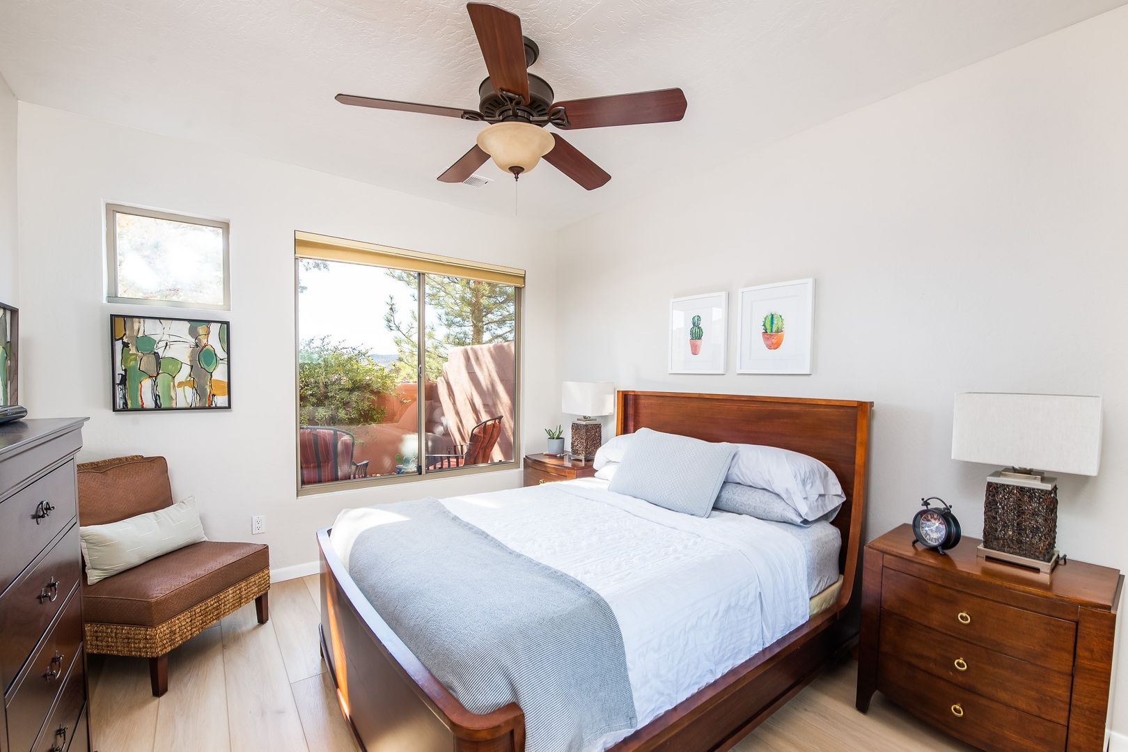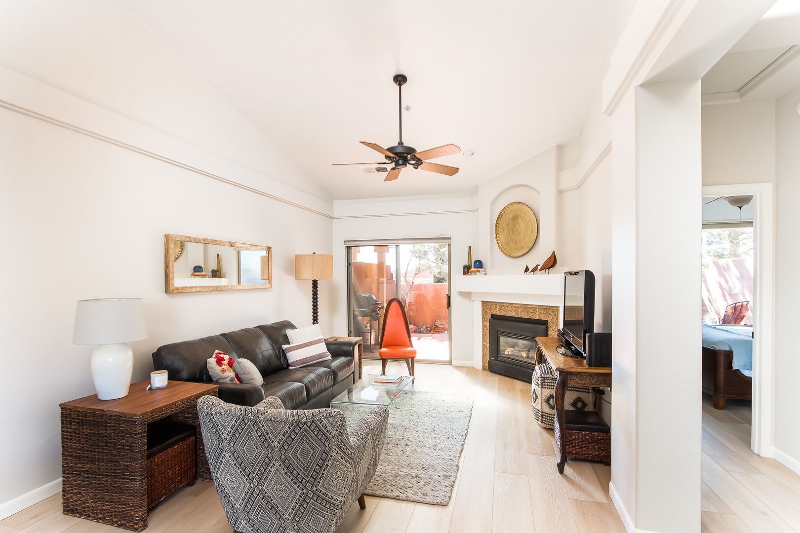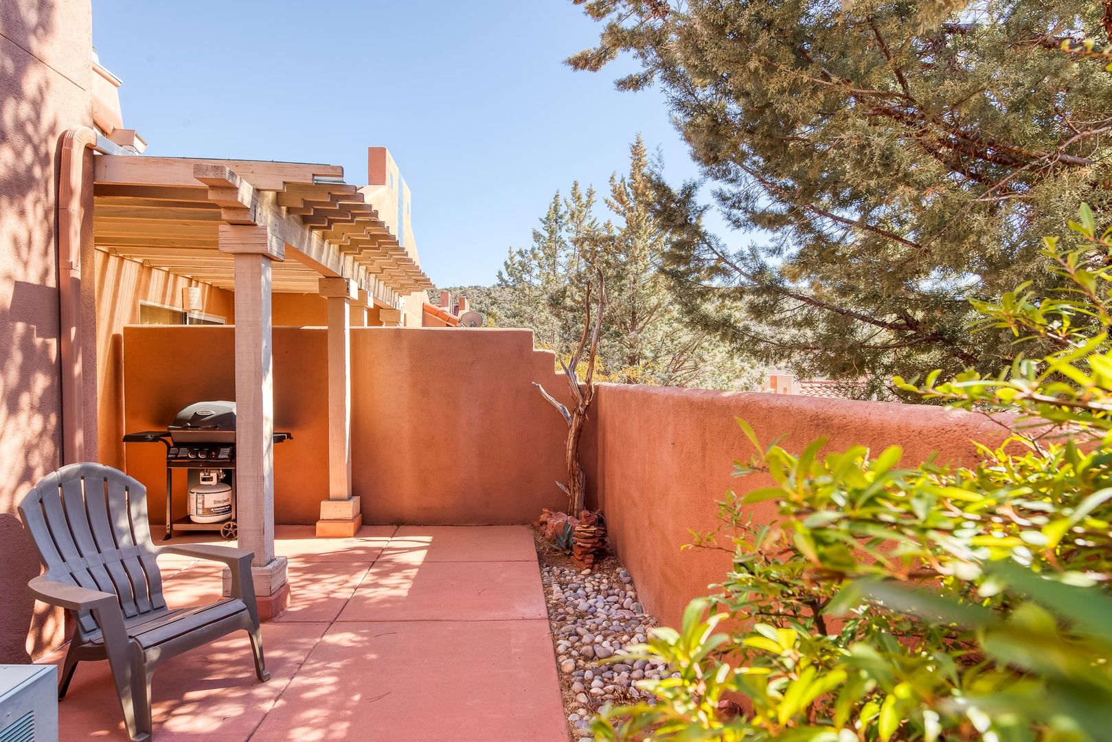 In the heart of West Sedona, this charming updated 2 bedroom 1 bath townhome sits high atop the hill in the lovely Nepenthe community. It offers over 900 sq. feet of living space featuring vaulted ceilings, cozy corner fireplace in the living room, and split- bedroom design with queen beds in each and full bath off the hallway. A well equipped kitchen leads to the adjoining dining area with custom copper table, or enjoy the BBQ