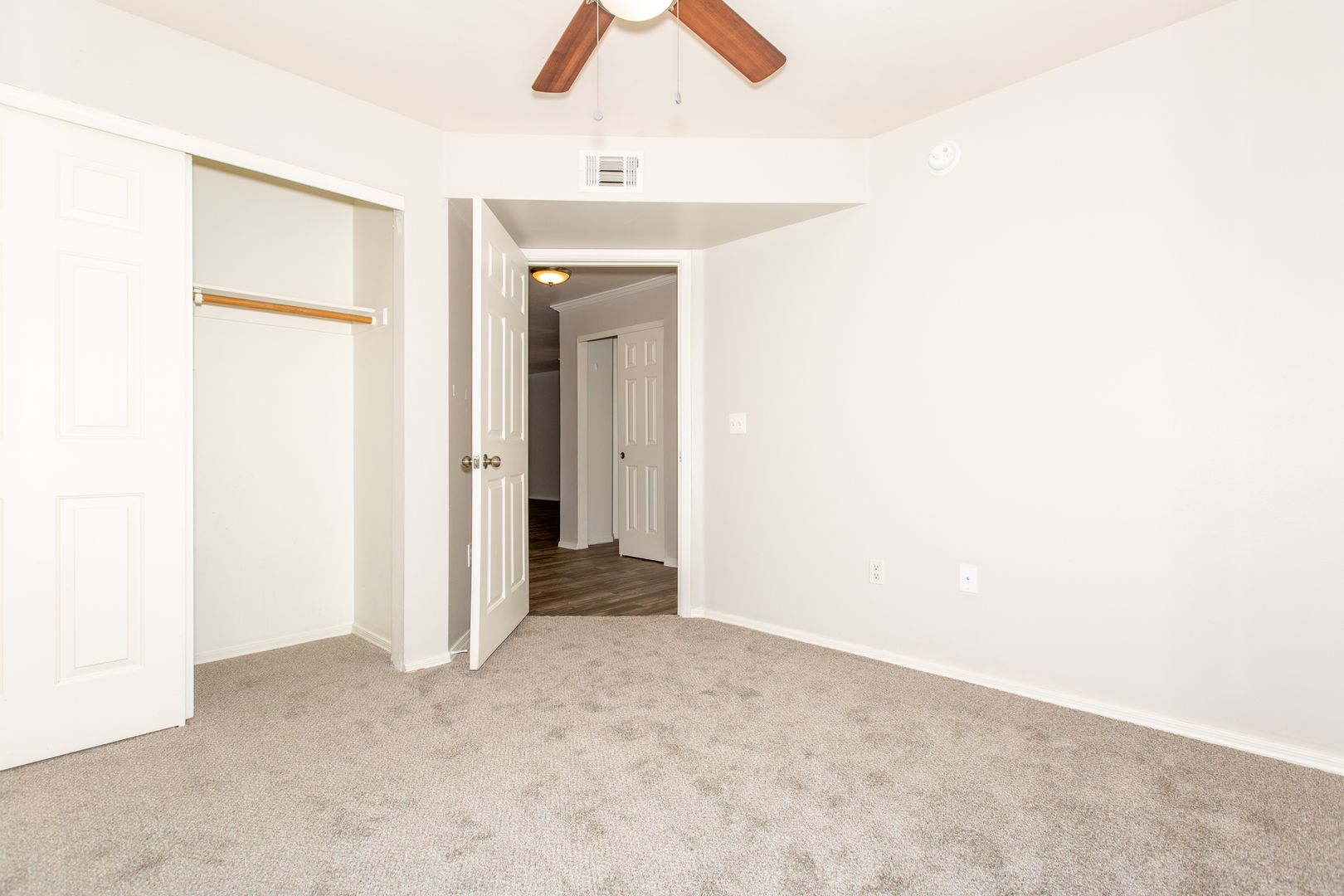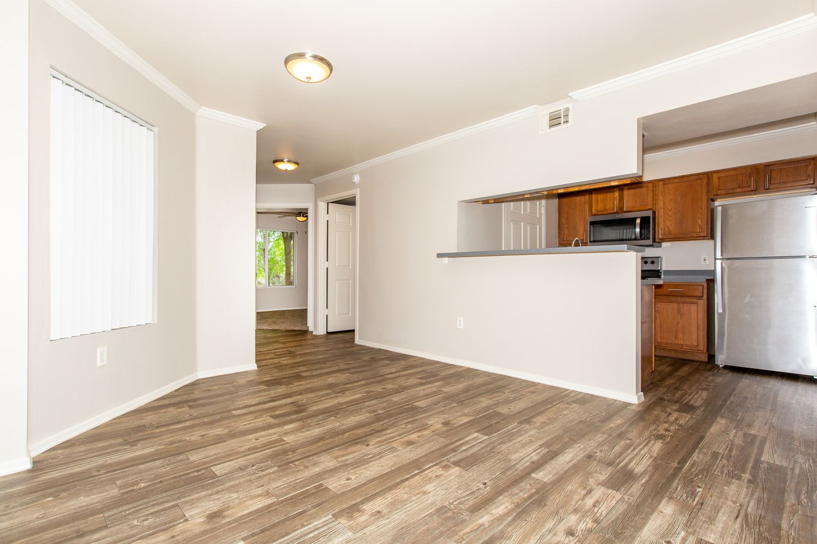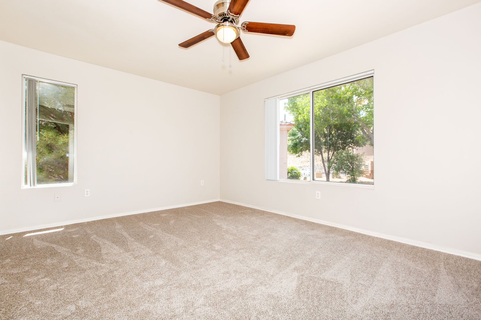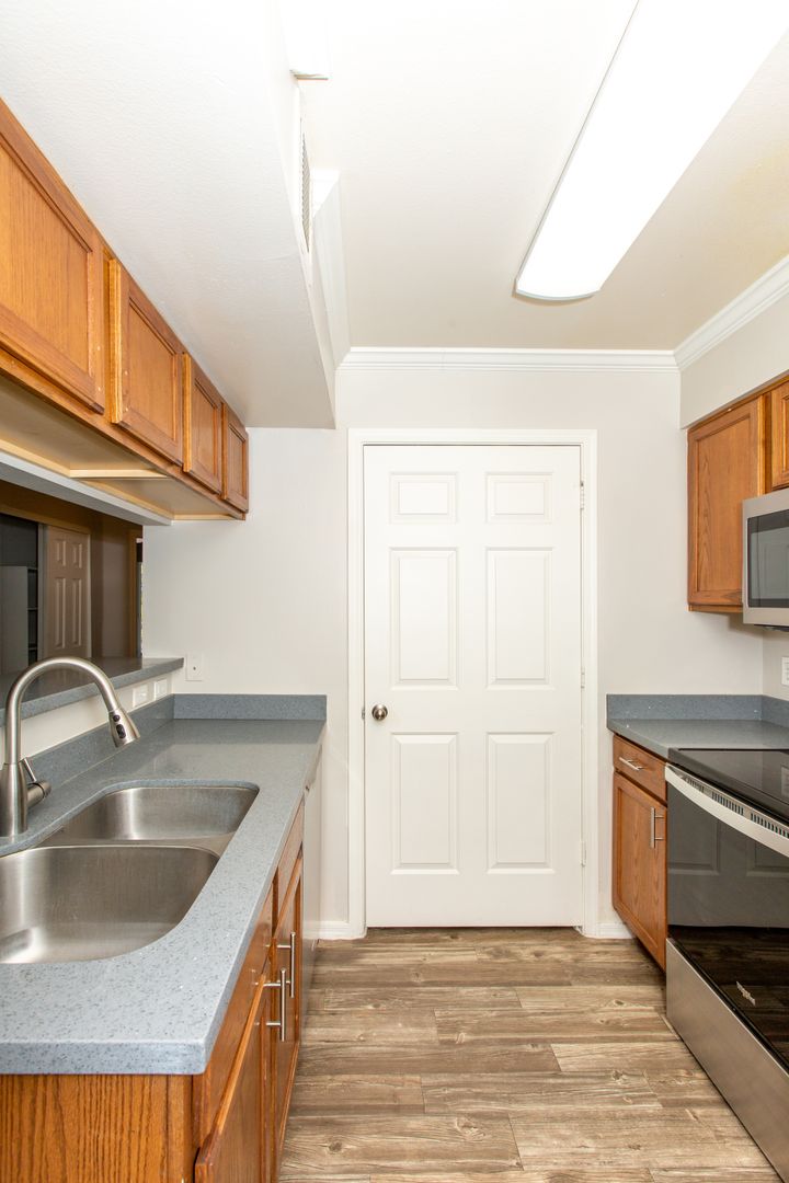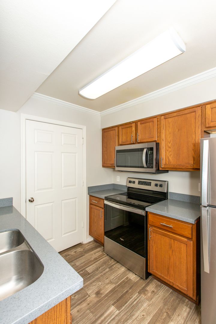 Three bedroom, two bathroom unit. Hard surface flooring in the main area with carpeted bedrooms. Bedrooms include large closets, ceiling fans. Kitchen area includes bar seating and ample room for cooking with a full size refrigerator, electric range/cooktop, and microwave. Each unit either a patio or balcony. All have washer/dryers hookups.