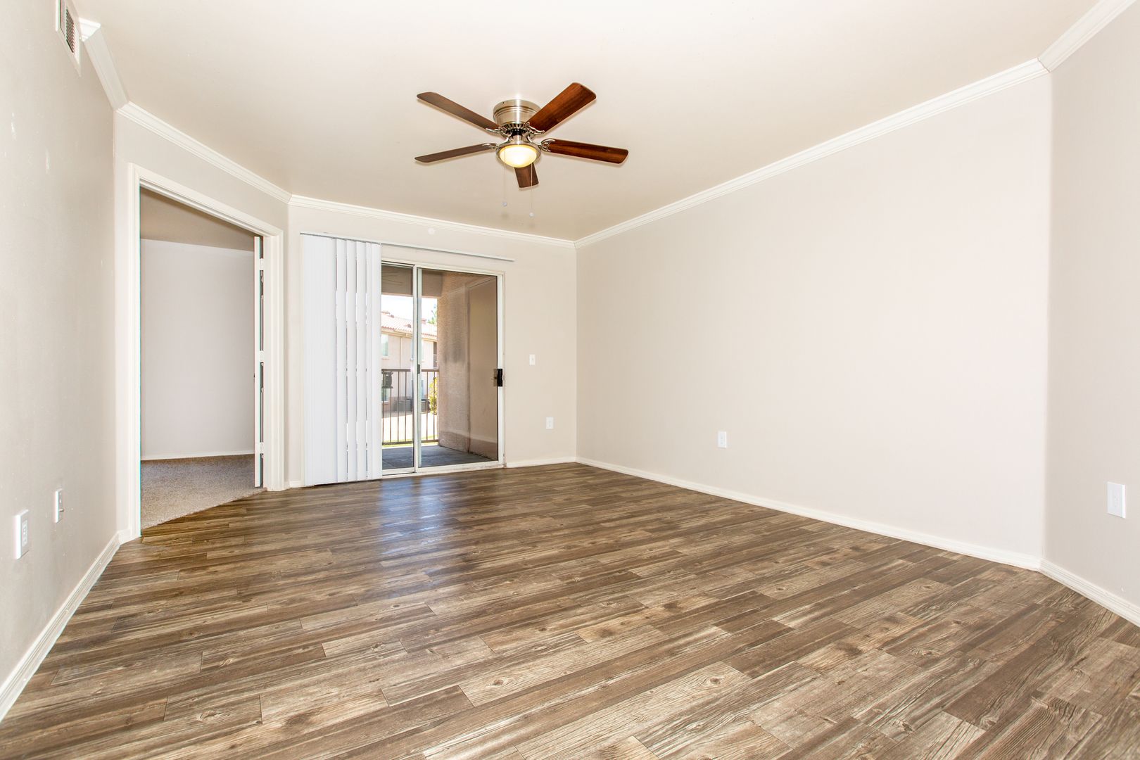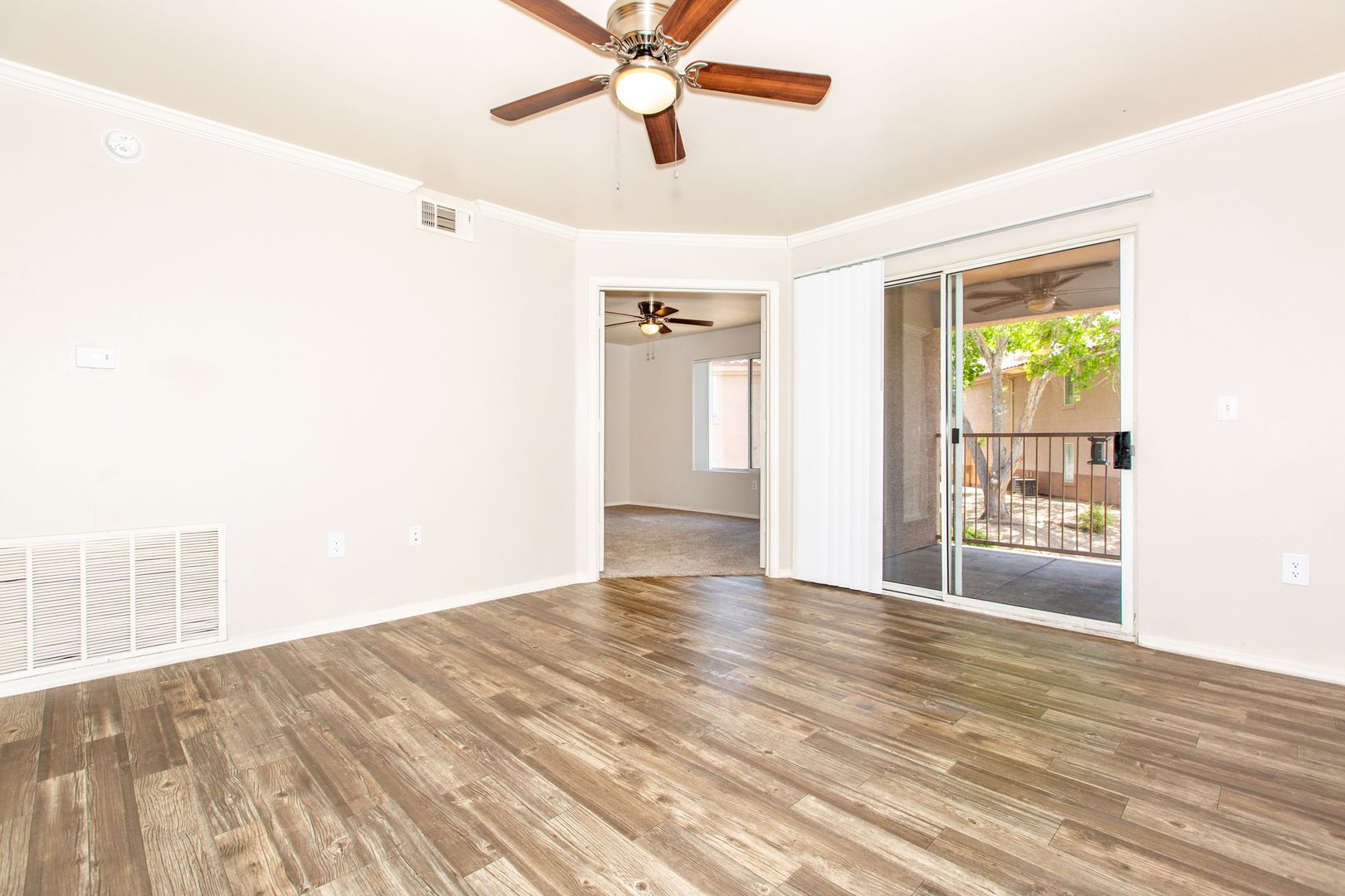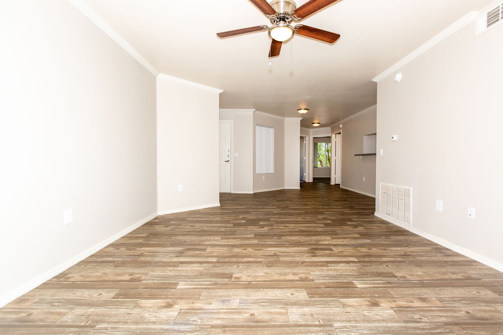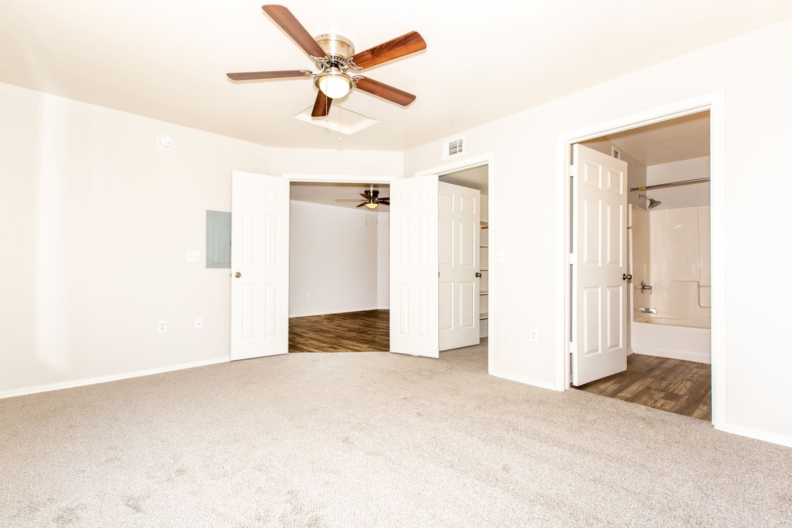 Three bedroom, two bathroom unit. Hard surface flooring in the main area with carpeted bedrooms. Bedrooms include large closets, ceiling fans. Kitchen area includes bar seating and ample room for cooking with a full size refrigerator, electric range/cooktop, and microwave. Each unit either a patio or balcony. All have washer/dryers hookups.
