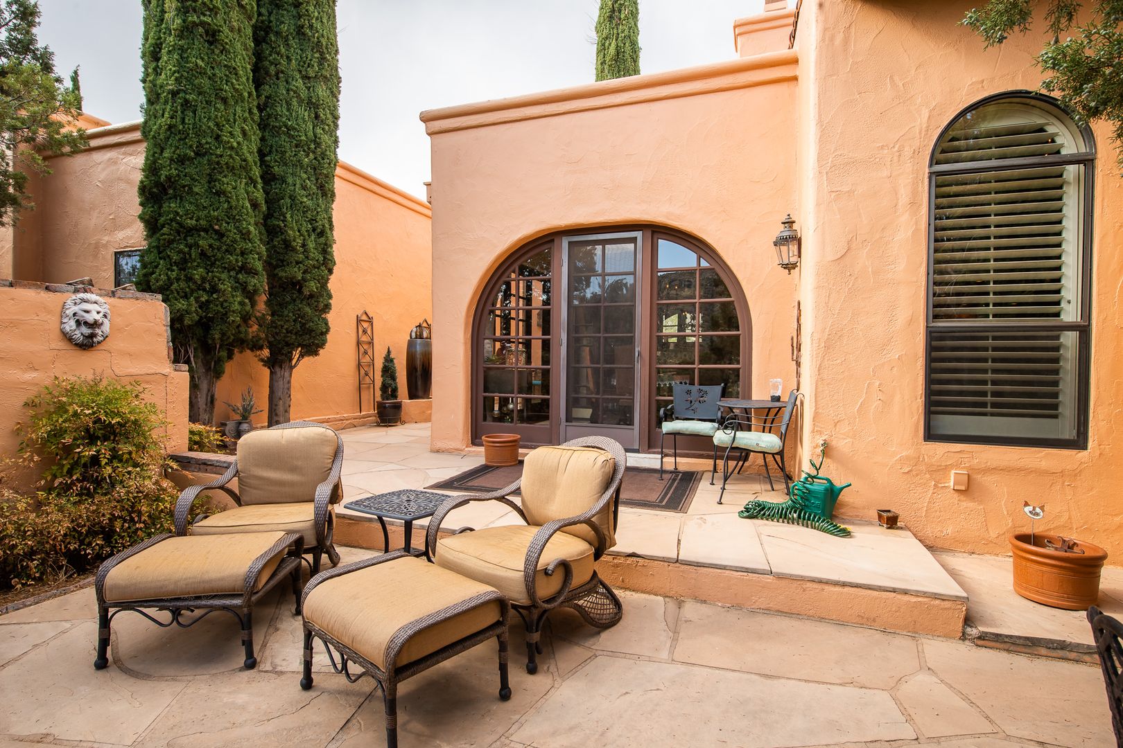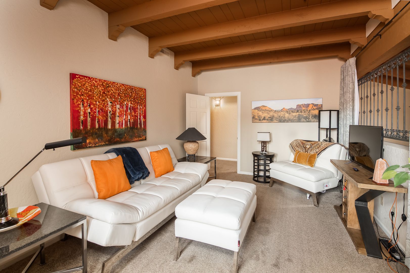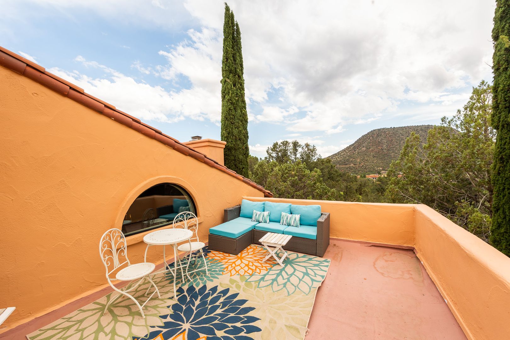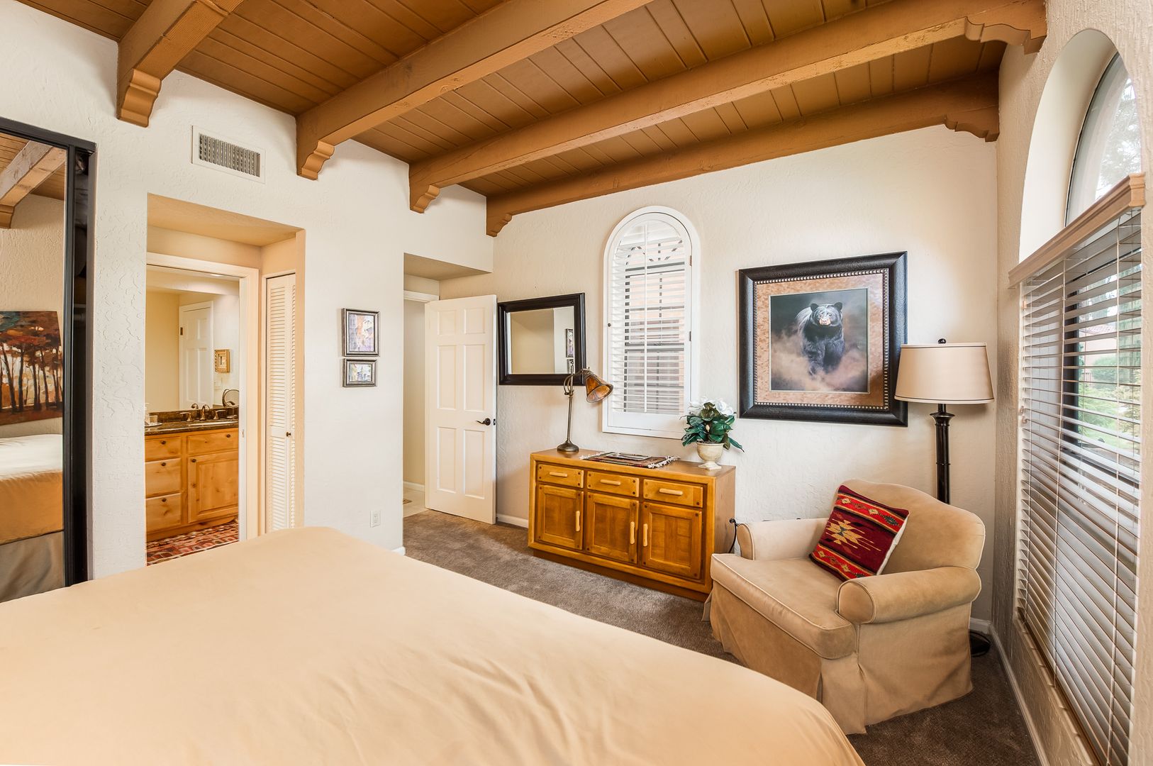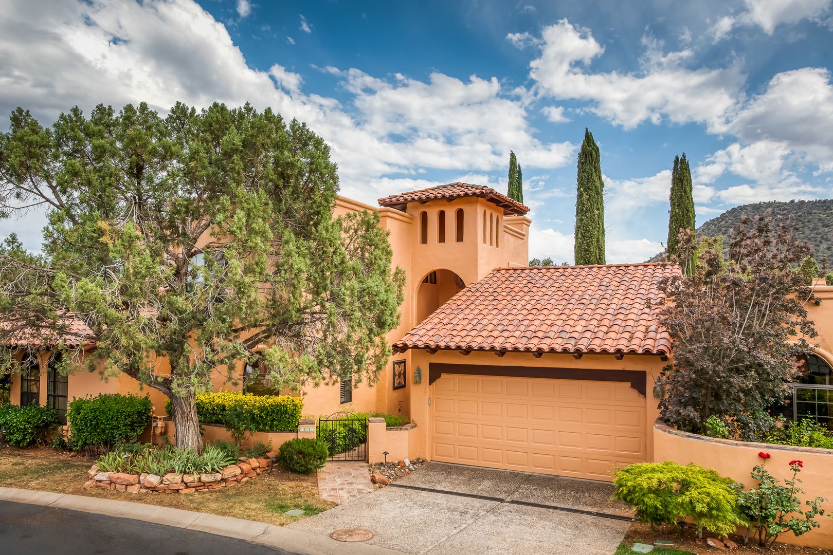 This enchanting and stylish 3BR/2BA condominium is in the gated community of The Ridge, a subdivision located in The Village of Oak Creek with a Tuscan motif. Built in 1985 the home spans two floors and is approximately 2,084 square feet. The great room opens into the kitchen and the dining area, both of which offer seating options for guests. Kitchen is fully updated with stainless steel appliances and ample counter space for cooking. The dining area is comfortably tucked off the kitchen and is perfect for a more formal evening or a private work space. Off the dining room is a large private patio with outdoor seating, privacy, and incredible views.
