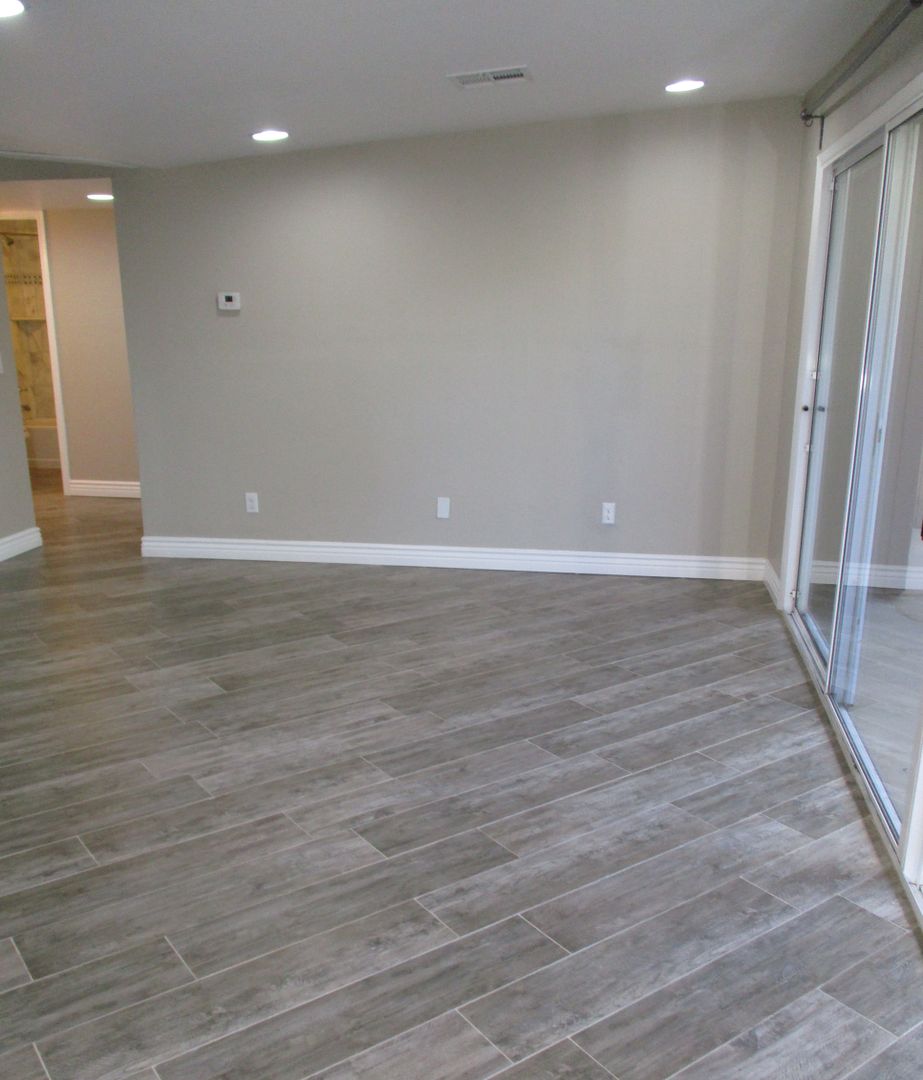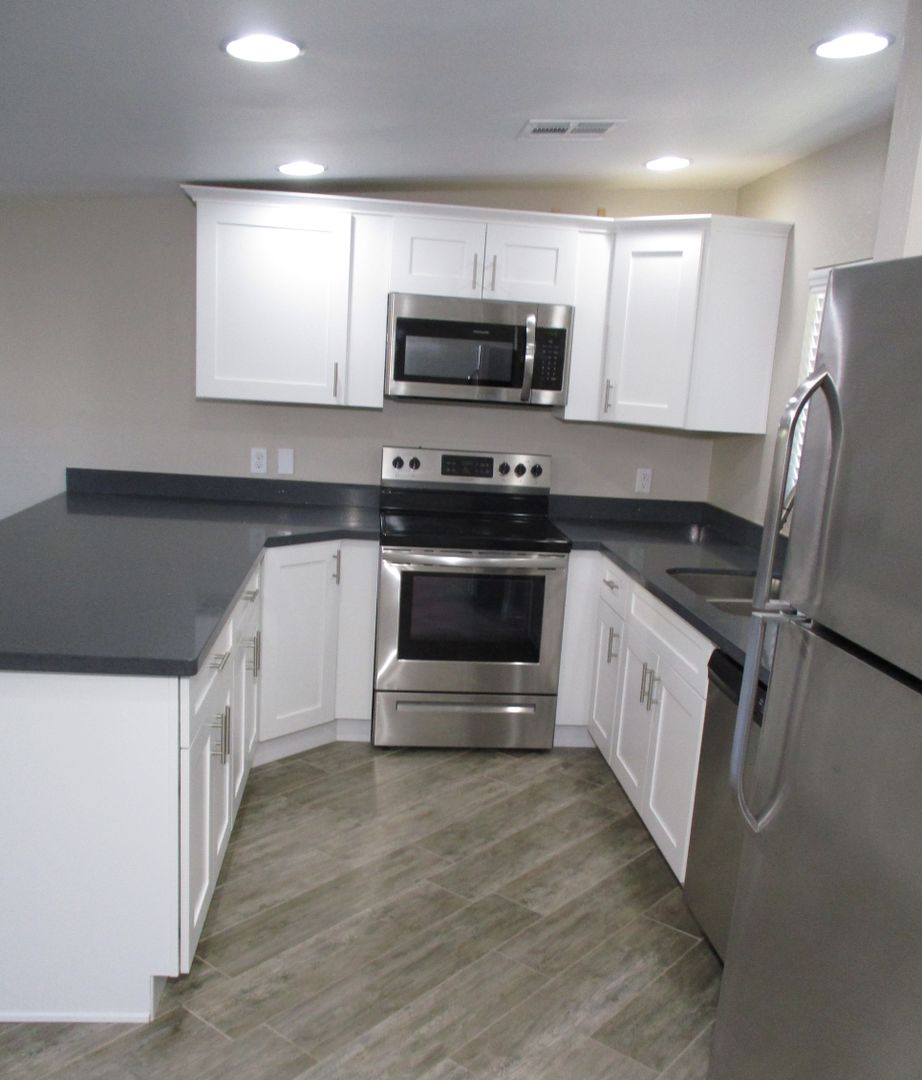 This stylish 1BR/1BA downstairs unit, approx. 800 sq. ft. offers clean sleek lines, contemporary flair, energy efficiency and views from the front and back. Each unit has their own front patio area as well as back patio area. Inside walls are painted a warm color with white baseboards. Living room highlights great room concept with twelve foot wide sliding glass door to the private outside patio/deck. Charming kitchen with white cabinets, stainless steel appliances, beautiful grey quartz counter top, pantry, electric stove, window above the kitchen sink and breakfast bar. Spacious bedroom with walk in closet. Lovely bathroom with marble tub/shower combination, grey quartz counter top and sink. Washer/Dryer located right next to the bathroom.